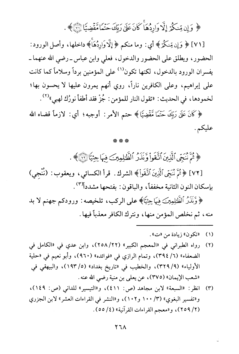 [71] {وَإِنْ مِنْكُمْ} أي: وما منكم {إِلَّا وَارِدُهَا} داخلها، وأصل الورود: الحضور، ويطلق على الحضور والدخول، فعلي وابن عباس -رضي الله عنهما- يفسران الورود بالدخول، لكنها تكون (¬1) على المؤمنين بردًا وسلامًا كما كانت على إبراهيم، وعلى الكافرين نارًا، روي أنهم يمرون عليها لا يحسون بها؛ لخمودها، في الحديث: "تقول النار للمؤمن: جُزْ فقد أطفأ نورُك لهبي" (¬2).
