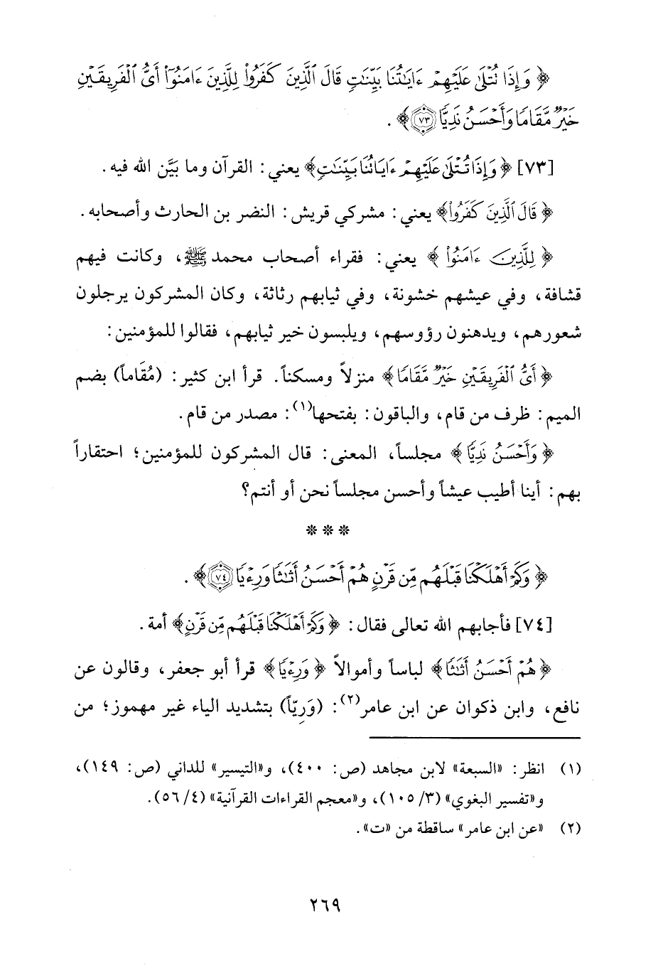 {هُمْ أَحْسَنُ أَثَاثًا} لباسًا وأموالًا {وَرِئْيًا} قرأ أبو جعفر، وقالون عن نافع، وابن ذكوان عن ابن عامر (¬2): (وَرِيًّا) بتشديد الياء غير مهموز؛ من