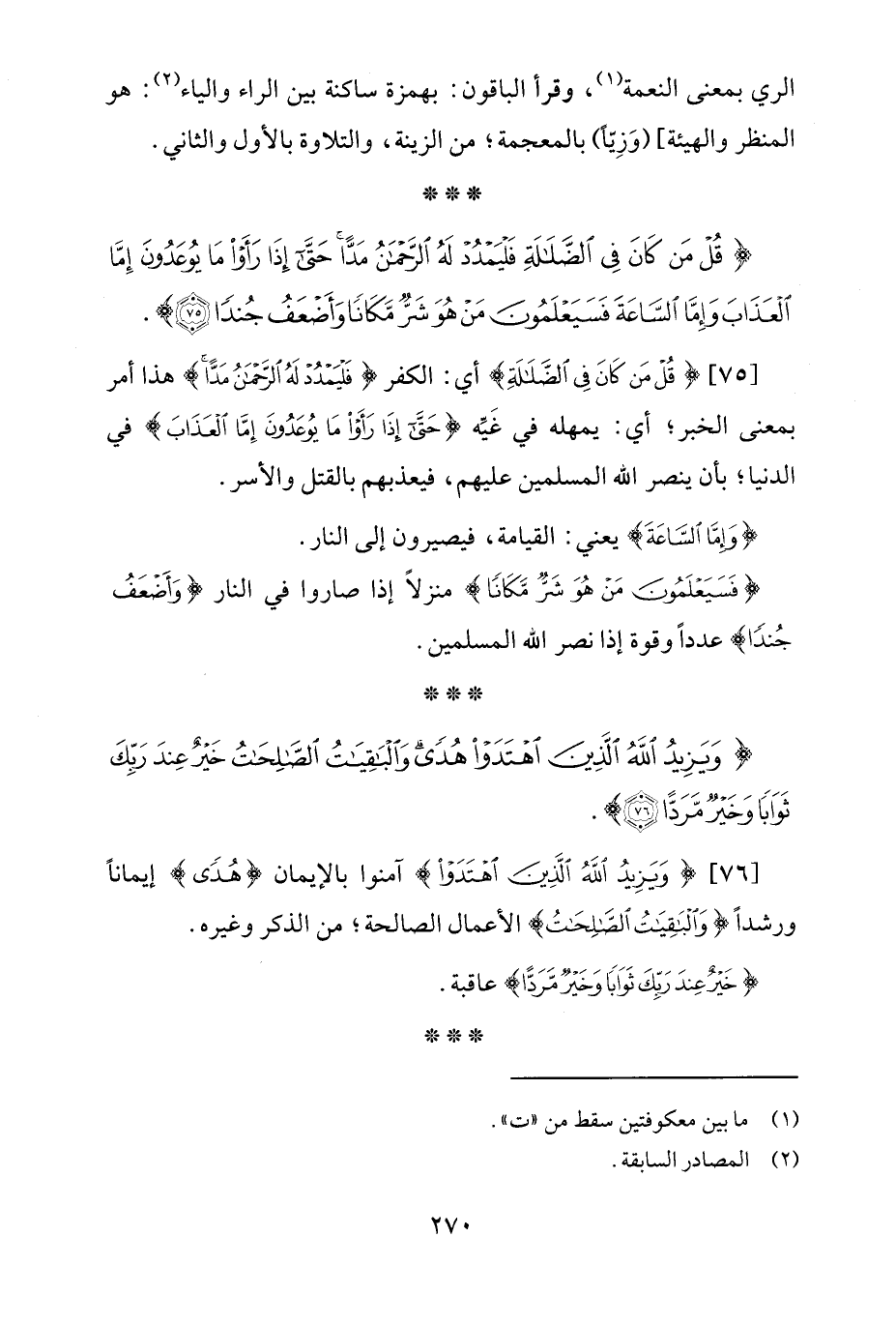 [75] {قُلْ مَنْ كَانَ فِي الضَّلَالَةِ} أي: الكفر {فَلْيَمْدُدْ لَهُ الرَّحْمَنُ مَدًّا} هذا أمر بمعنى الخبر؛ أي: يمهله في غَيِّه {حَتَّى إِذَا رَأَوْا مَا يُوعَدُونَ إِمَّا الْعَذَابَ} في الدنيا؛ بأن ينصر الله المسلمين عليهم، فيعذبهم بالقتل والأسر.