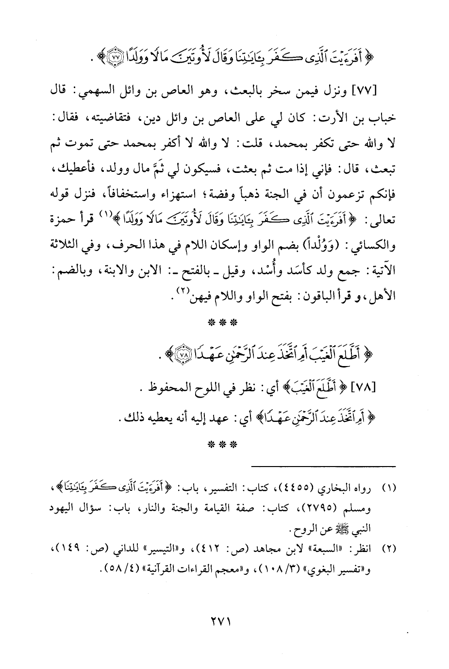 [77] ونزل فيمن سخر بالبعث، وهو العاص بن وائل السهمي: قال خباب بن الأرت: كان لي على العاص بن وائل دين، فتقاضيته، فقال: لا والله حتى تكفر بمحمد، قلت: لا والله لا أكفر بمحمد حتى تموت ثم تبعث، قال: فإني إذا مت ثم بعثت، فسيكون لي ثَمَّ مال وولد، فأعطيك، فإنكم تزعمون أن في الجنة ذهبًا وفضة؛ استهزاء واستخفافًا، فنزل قوله تعالى: {أَفَرَأَيْتَ الَّذِي كَفَرَ بِآيَاتِنَا وَقَالَ لأُوتَيَنَّ مَالًا وَوَلَدًا} (¬1) قرأ حمزة والكسائي: (وَوُلْدًا) بضم الواو وإسكان اللام في هذا الحرف، وفي الثلاثة الآتية: جمع ولد كأسَد وأُسْد، وقيل -بالفتح-: الابن والابنة، وبالضم: الأهل، وقرأ الباقون: بفتح الواو واللام فيهن (¬2).