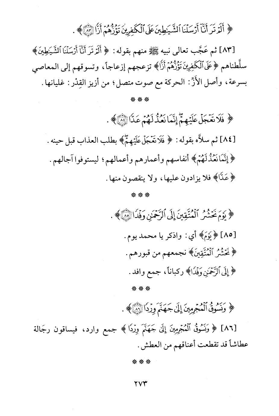 [86] {وَنَسُوقُ الْمُجْرِمِينَ إِلَى جَهَنَّمَ وِرْدًا} جمع وارد، فيساقون رجَالة عطاشًا قد تقطعت أعناقهم من العطش.