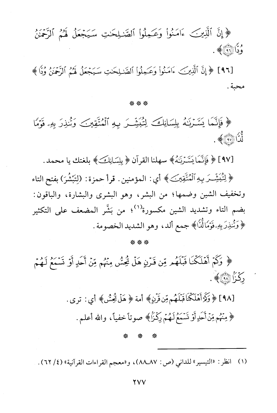 {لِتُبَشِّرَ بِهِ الْمُتَّقِينَ} أي: المؤمنين. قرأ حمزة: (لِتَبْشُرَ) بفتح التاء وتخفيف الشين وضمها؛ من البشر، وهو البشرى والبشارة، والباقون: بضم التاء وتشديد الشين مكسورة (¬1)؛ من بَشَّر المضعف على التكثير {وَتُنْذِرَ بِهِ قَوْمًا لُدًّا} جمع ألد، وهو الشديد الخصومة.