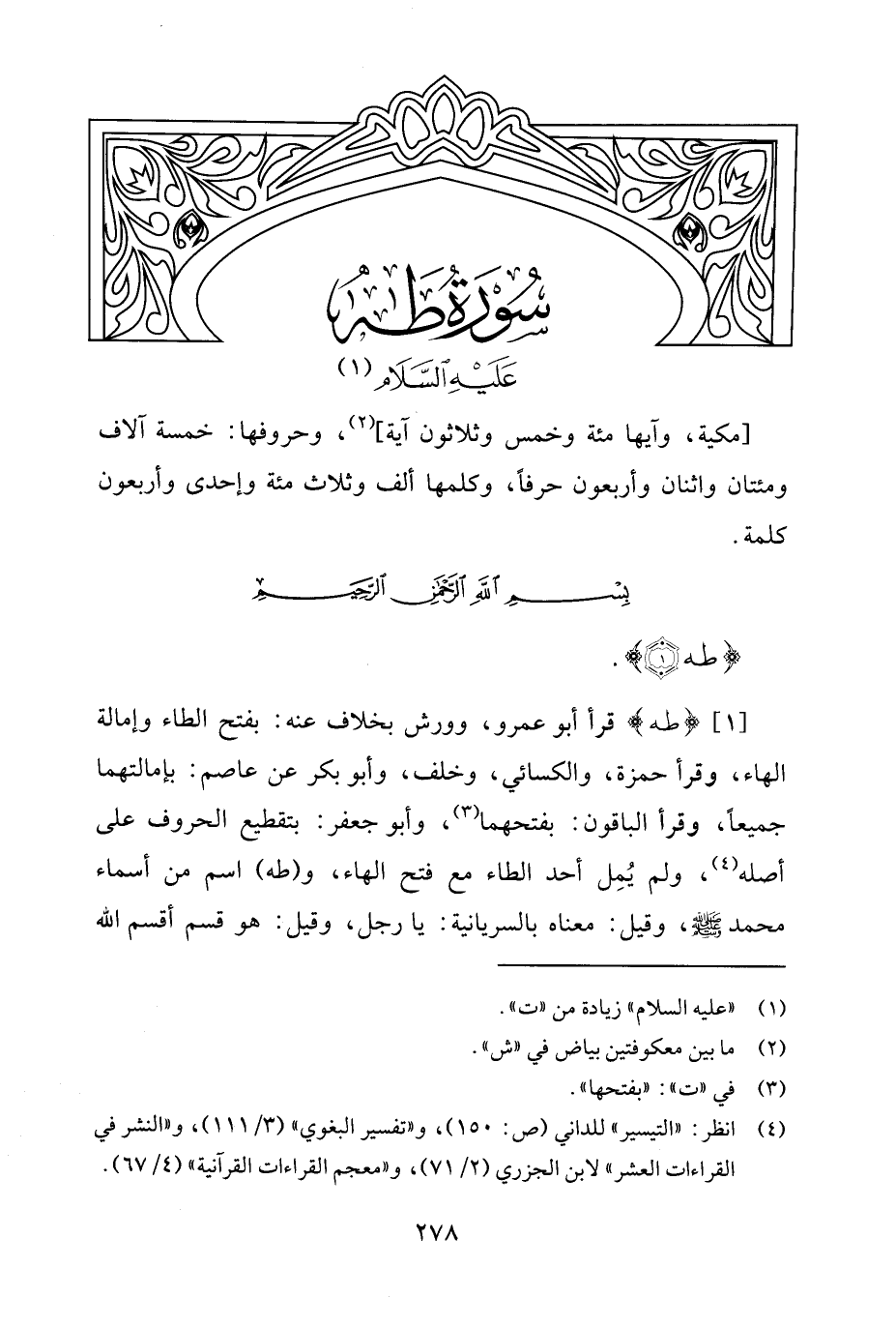 [1] {طه} قرأ أبو عمرو، وورش بخلاف عنه: بفتح الطاء وإمالة الهاء، وقرأ حمزة، والكسائي، وخلف، وأبو بكر عن عاصم: بإمالتهما جميعًا، وقرأ الباقون: بفتحهما (¬3)، وأبو جعفر: بتقطيع الحروف على أصله (¬4)، ولم يُمِل أحد الطاء مع فتح الهاء، و (طه) اسم من أسماء محمد - صلى الله عليه وسلم -، وقيل: معناه بالسريانية: يا رجل، وقيل: هو قسم أقسم الله