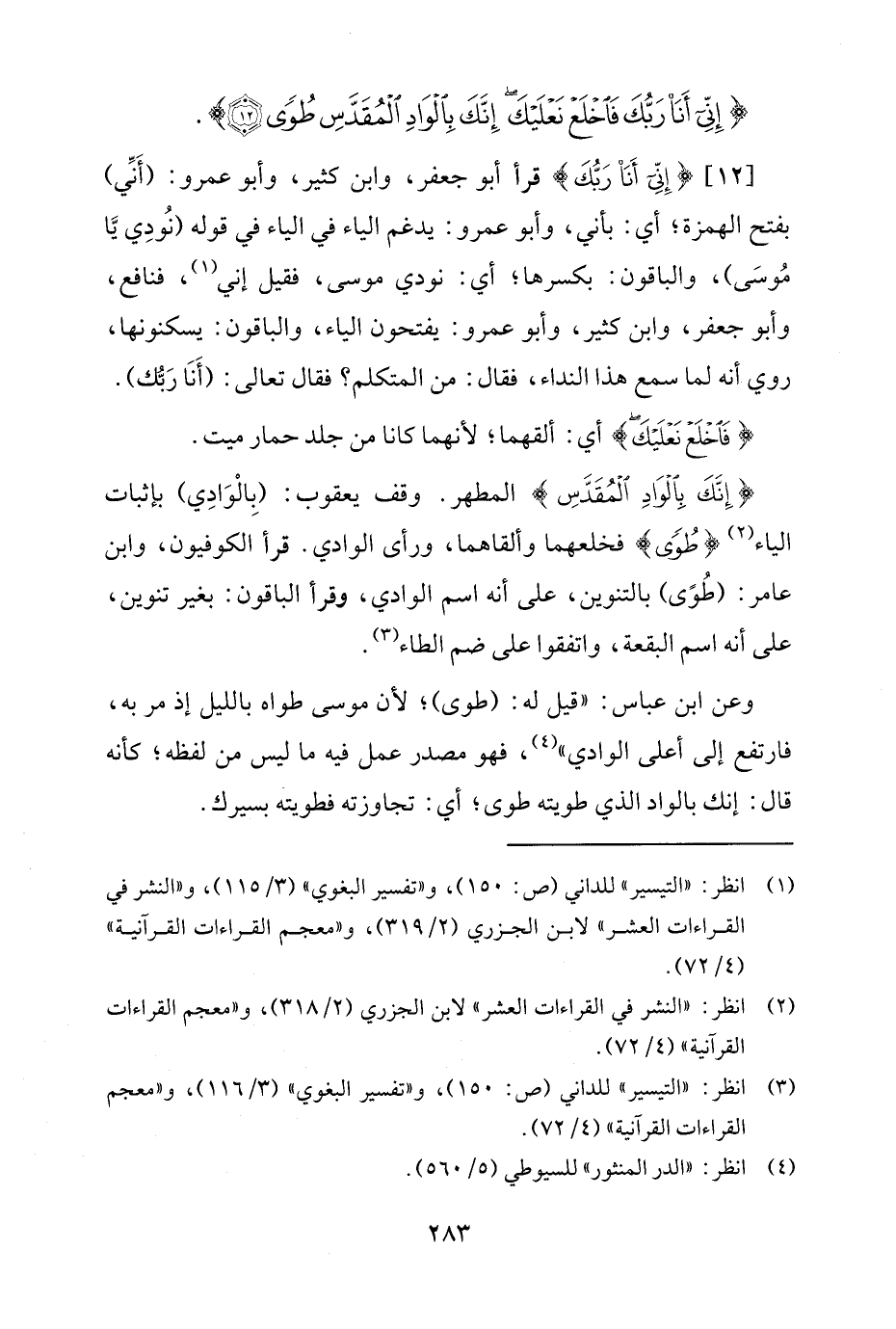 {إِنَّكَ بِالْوَادِ الْمُقَدَّسِ} المطهر. وقف يعقوب: (بِالْوَادِي) بإثبات الياء (¬2) {طُوًى} فخلعهما وألقاهما، ورأى الوادي. قرأ الكوفيون، وابن عامر: (طُوًى) بالتنوين، على أنه اسم الوادي، وقرأ الباقون: بغير تنوين، على أنه اسم البقعة، واتفقوا على ضم الطاء (¬3).