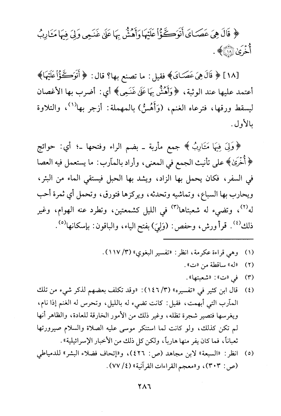 [18] {قَالَ هِيَ عَصَايَ} فقيل: ما تصنع بها؟ قال: {أَتَوَكَّأُ عَلَيْهَا} أعتمد عليها عند الوثبة، {وَأَهُشُّ بِهَا عَلَى غَنَمِي} أي: أضرب بها الأغصان ليسقط ورقها، فترعاه الغنم، (وَأَهُسُّ) بالمهملة: أزجر بها (¬1)، والتلاوة بالأول.