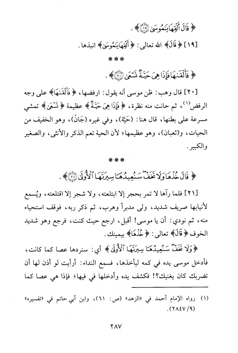 [21] فلما رآها لا تمر بحجر إلا ابتلعته، ولا شجر إلا اقتلعته، ويُسمع لأنيابها صريف شديد، ولى مدبرًا وهرب، ثم ذكر ربه، فوقف استحياء منه، ثم نودي: أن يا موسى! أقبل، ارجع حيث كنت، فرجع وهو شديد الخوف {قَالَ} تعالى: {خُذْهَا} بيمينك.