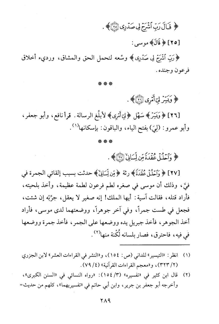 [27] {وَاحْلُلْ عُقْدَةً} رثة {مِنْ لِسَانِي} حدثت بسبب إلقائي الجمرة في فيَّ، وذلك أن موسى في صغره لطم فرعون لطمة عظيمة، وأخذ بلحيته، فأراد قتله، فقالت آسية؛ أيها الملك! إنه صغير لا يعقل، جرِّبْه إن شئت، فجعل في طست جمرًا، وفي آخر جوهرًا، ووضعتهما لدى موسى، فأراد أخذ الجوهر، فأخذ جبريل يده ووضعها على الجمر، فأخذ جمرة ووضعها في فيه، فاحترق، فصار بلسانه لُكْنة منها (¬2).