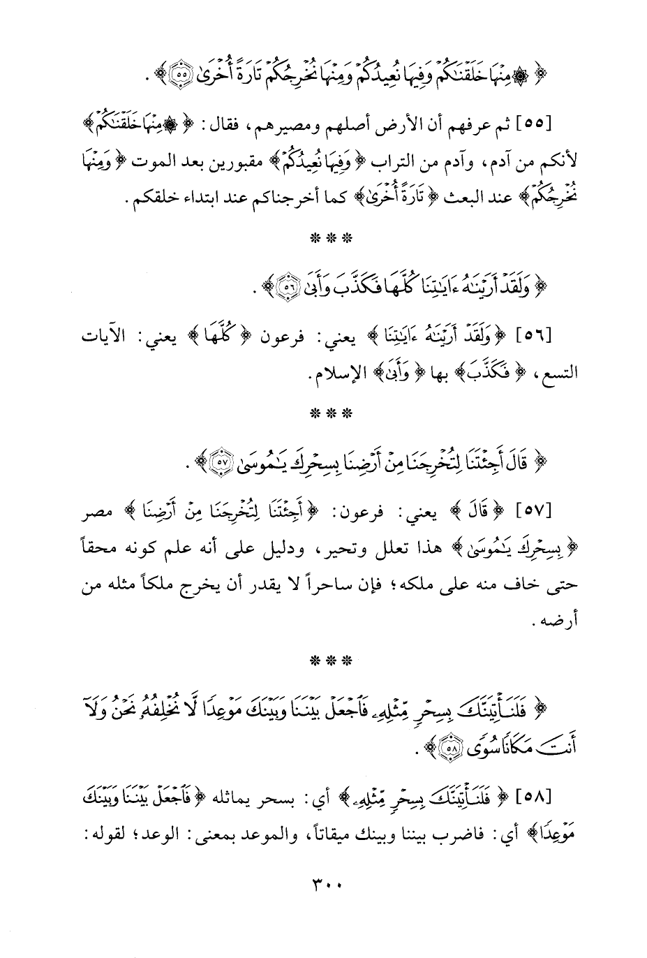 [55] ثم عرفهم أن الأرض أصلهم ومصيرهم، فقال: {مِنْهَا خَلَقْنَاكُمْ} لأنكم من آدم، وآدم من التراب {وَفِيهَا نُعِيدُكُمْ} مقبورين بعد الموت {وَمِنْهَا نُخْرِجُكُمْ} عند البعث {تَارَةً أُخْرَى} كما أخرجناكم عند ابتداء خلقكم.