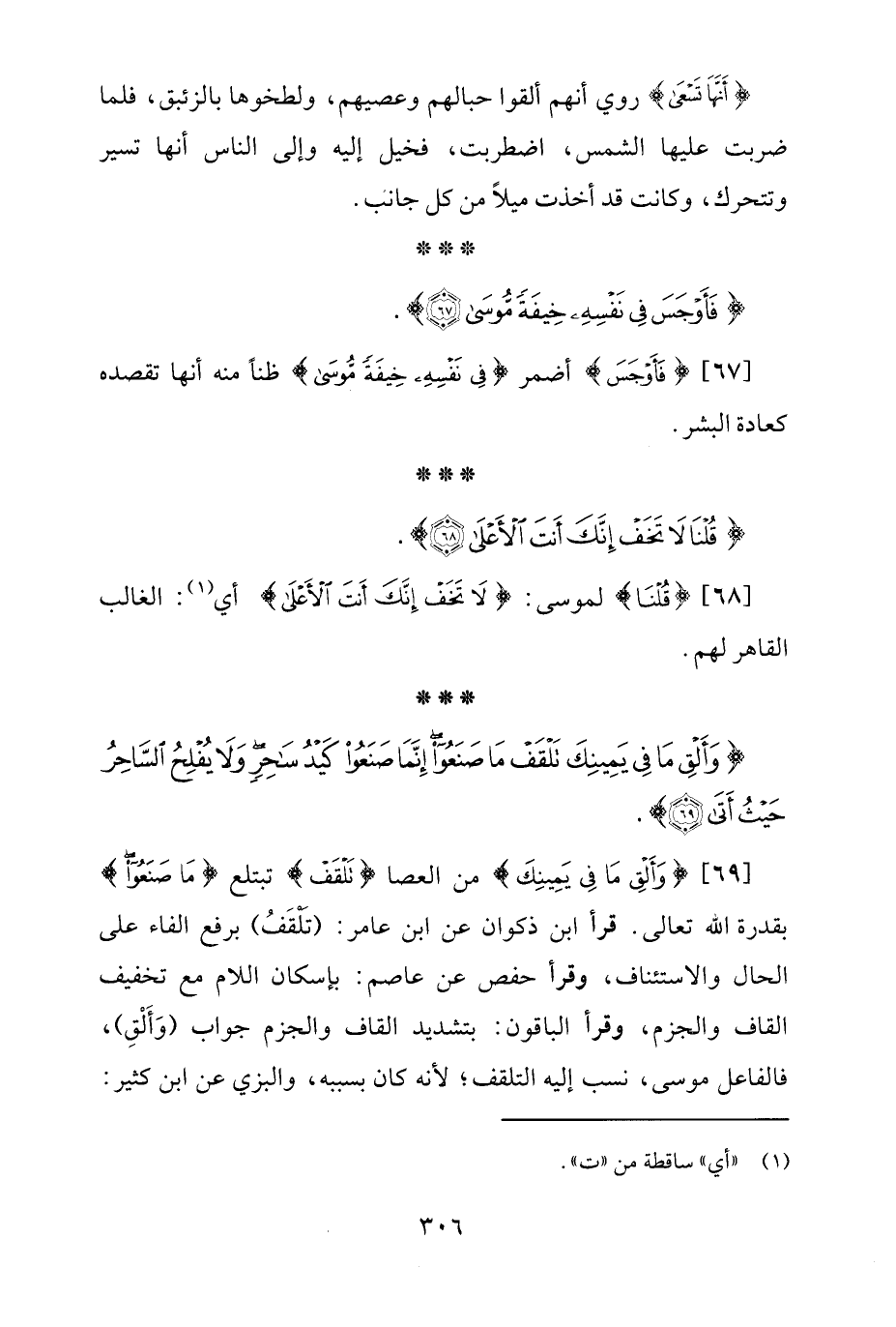 [69] {وَأَلْقِ مَا فِي يَمِينِكَ} من العصا {تَلْقَفْ} تبتلع {مَا صَنَعُوا} بقدرة الله تعالى. قرأ ابن ذكوان عن ابن عامر: (تلْقَفُ) برفع الفاء على الحال والاستئناف، وقرأ حفص عن عاصم: بإسكان اللام مع تخفيف القاف والجزم، وقرأ الباقون: بتشديد القاف والجزم جواب (وَأَلْقِ)، فالفاعل موسى، نسب إليه التلقف؛ لأنه كان بسببه، والبزي عن ابن كثير: