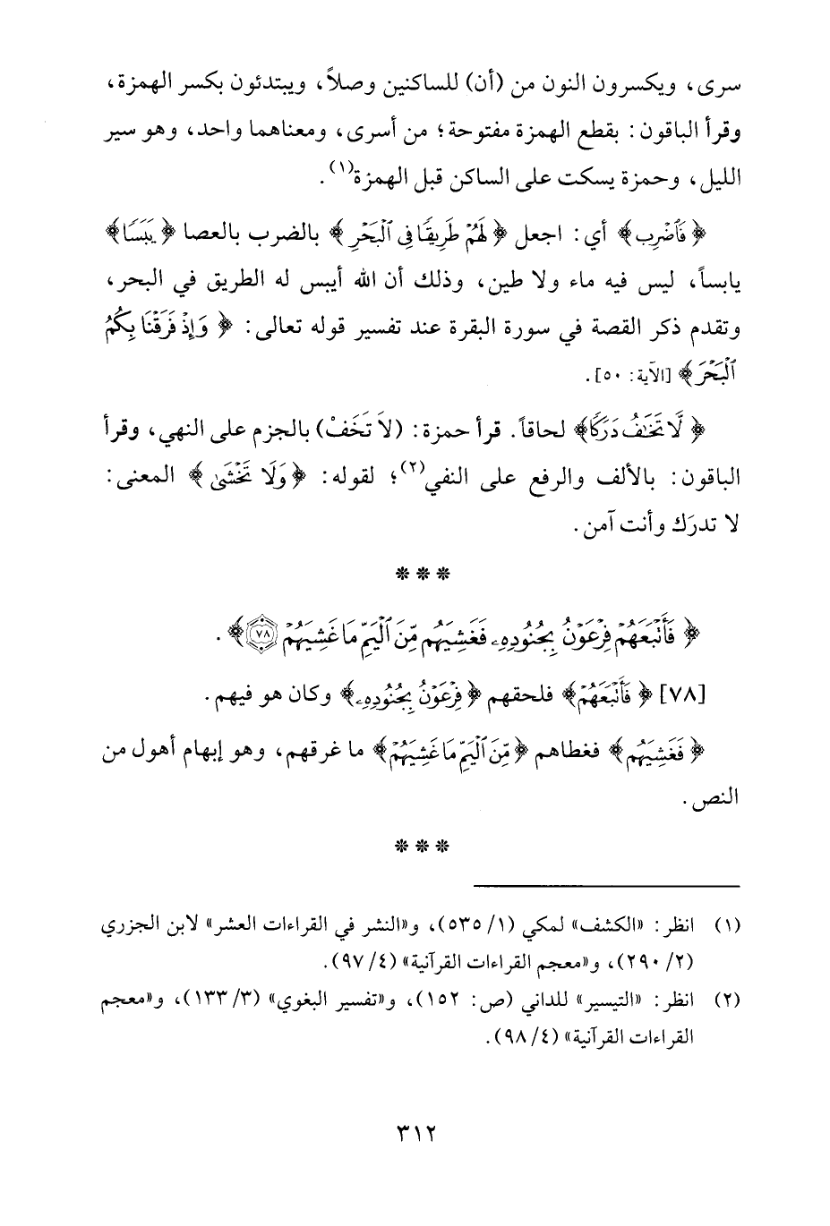 {لَا تَخَافُ دَرَكًا} لحاقًا. قرأ حمزة: (لاَ تَخَفْ) بالجزم على النهي، وقرأ الباقون: بالألف والرفع على النفي (¬2)؛ لقوله: {وَلَا تَخْشَى} المعنى: لا تدرَك وأنت آمن.