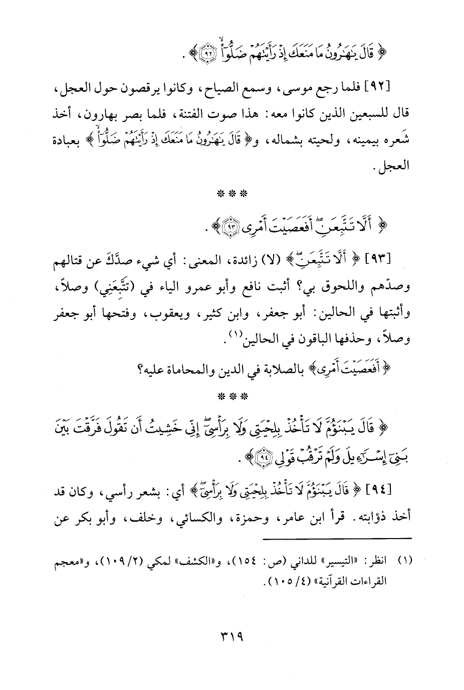 [93] {أَلَّا تَتَّبِعَنِ} (لا) زائدة، المعنى: أي شيء صدَّكَ عن قتالهم وصدّهم واللحوق بي؟ أثبت نافع وأبو عمرو الياء في (تتَّبِعَنِي) وصلًا، وأثبتها في الحالين: أبو جعفر، وابن كثير، ويعقوب، وفتحها أبو جعفر وصلًا، وحذفها الباقون في الحالين (¬1).