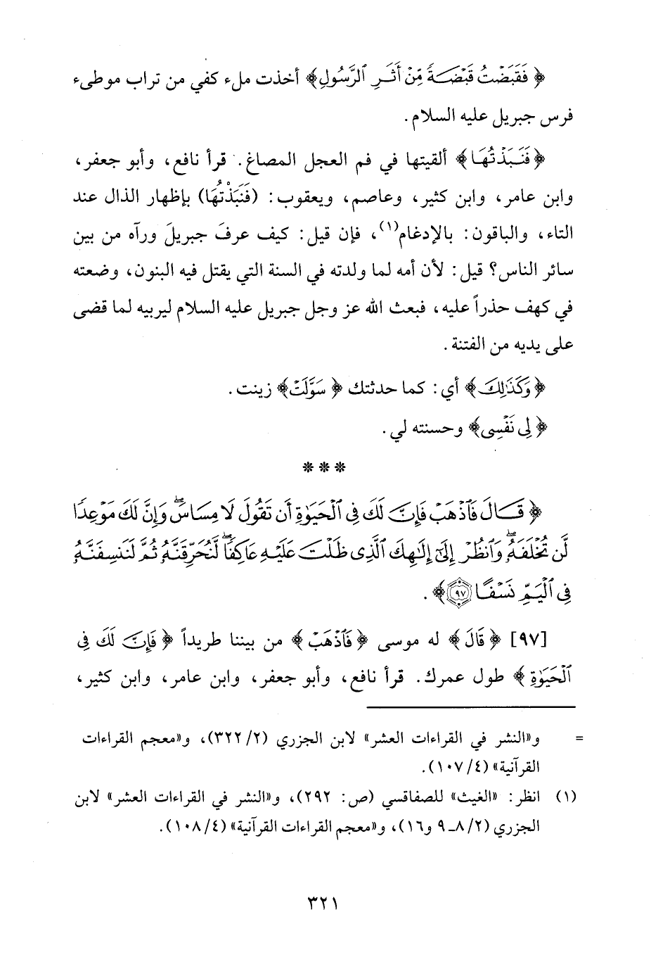 [97] {قَالَ} له موسى {فَاذْهَبْ} من بيننا طريدًا {فَإِنَّ لَكَ فِي الْحَيَاةِ} طول عمرك. قرأ نافع، وأبو جعفر، وابن عامر، وابن كثير،