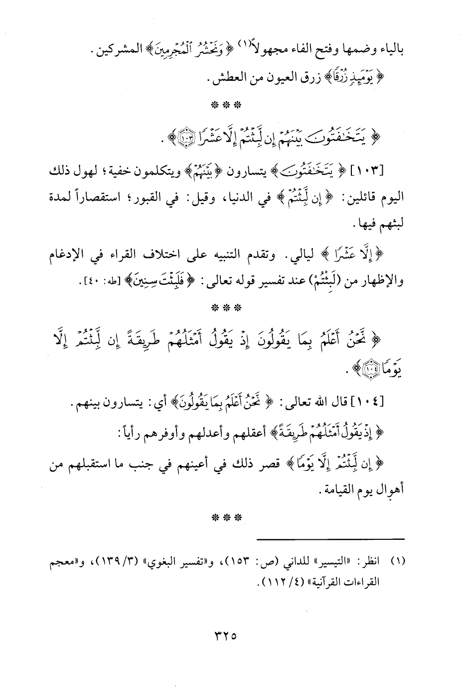 [103] {يَتَخَافَتُونَ} يتسارون {بَيْنَهُمْ} ويتكلمون خفية؛ لهول ذلك اليوم قائلين: {إِنْ لَبِثْتُمْ} في الدنيا، وقيل: في القبور؛ استقصارًا لمدة لبثهم فيها.