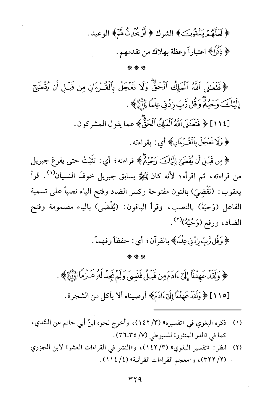 {مِنْ قَبْلِ أَنْ يُقْضَى إِلَيْكَ وَحْيُهُ} قراءته؛ أي: تثَبَّتْ حتى يفرغ جبريل من قراءته، ثم اقرأه؛ لأنه كان - صلى الله عليه وسلم - يسابق جبريل خوفَ النسيان (¬1). قرأ يعقوب: (نَقْضِيَ) بالنون مفتوحة وكسر الضاد وفتح الياء نصبًا على تسمية الفاعل (وَحْيَهُ) بالنصب، وقرأ الباقون: (يُقْضَى) بالياء مضمومة وفتح الضاد، ورفع (وَحْيُهُ) (¬2).