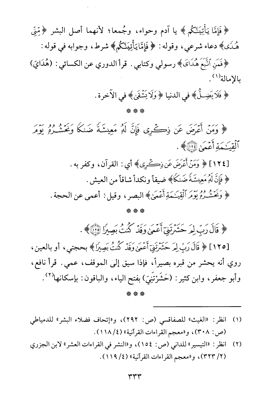 [125] {قَالَ رَبِّ لِمَ حَشَرْتَنِي أَعْمَى وَقَدْ كُنْتُ بَصِيرًا} بحجتي، أو بالعين، روي أنه يحشر من قبره بصيرًا، فإذا سيق إلى الموقف، عمي. قرأ نافع، وأبو جعفر، وابن كثير: (حَشَرْتنِيَ) بفتح الياء، والباقون: بإسكانها (¬2).
