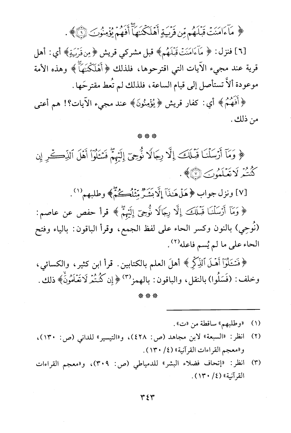 {وَمَا أَرْسَلْنَا قَبْلَكَ إِلَّا رِجَالًا نُوحِي إِلَيْهِمْ} قرأحفص عن عاصم: (نُوحِي) بالنون وكسر الحاء على لفظ الجمع، وقرأ الباقون: بالياء وفتح الحاء على ما لم يُسم فاعله (¬2).