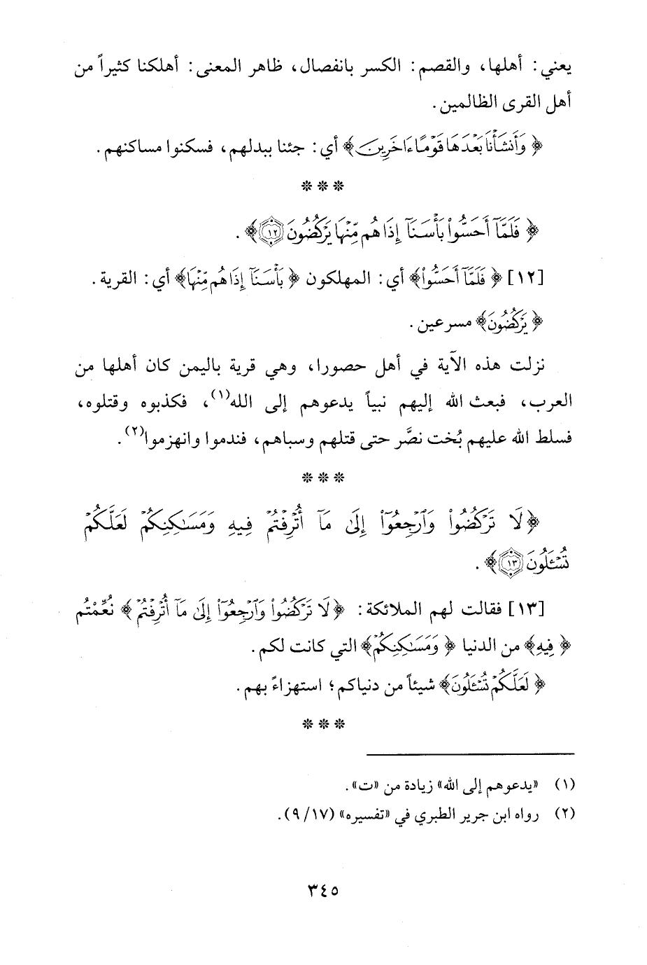 [13] فقالت لهم الملائكة: {لَا تَرْكُضُوا وَارْجِعُوا إِلَى مَا أُتْرِفْتُمْ} نُعِّمْتُم {فِيهِ} من الدنيا {وَمَسَاكِنِكُمْ} التي كانت لكم.
