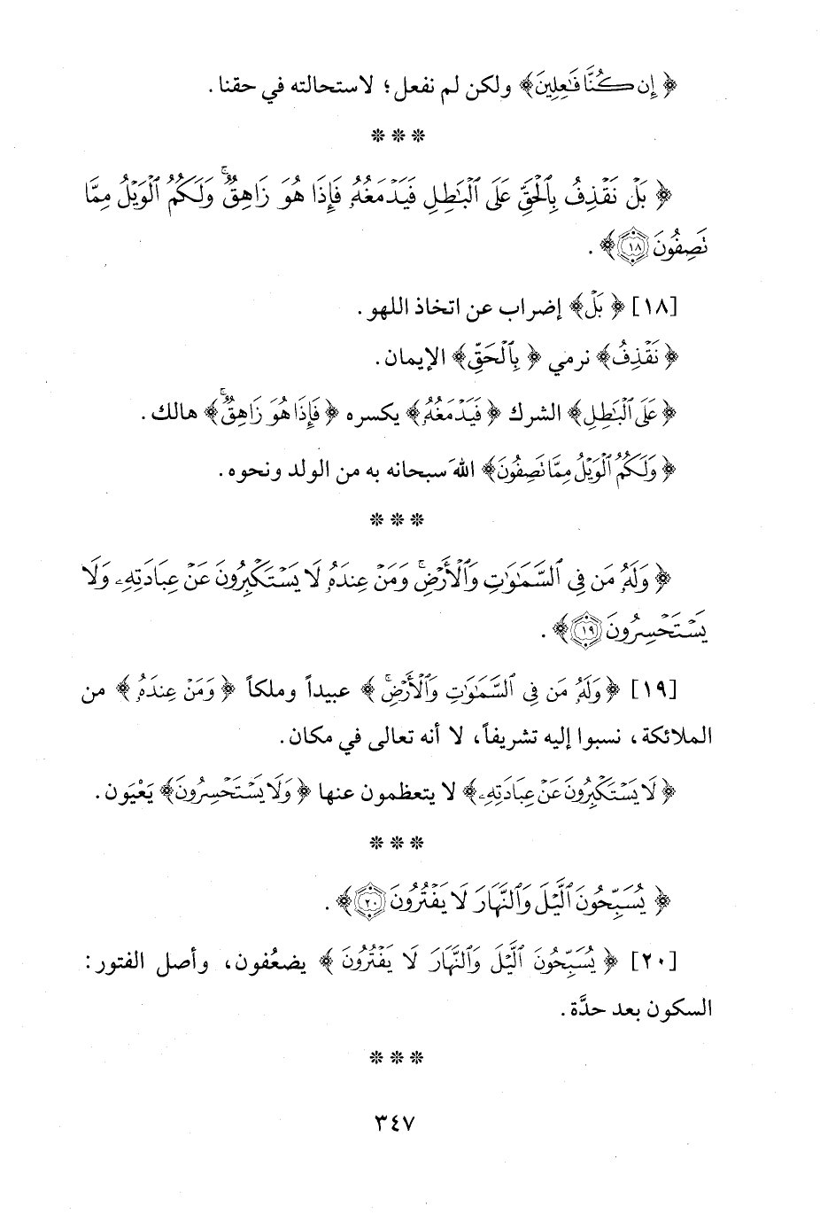 [20] {يُسَبِّحُونَ اللَّيْلَ وَالنَّهَارَ لَا يَفْتُرُونَ} يضعُفون، وأصل الفتور: السكون بعد حدَّة.