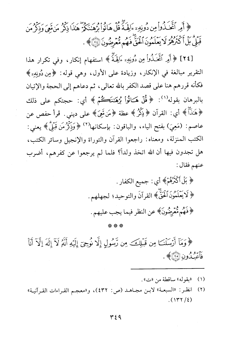 [24] {أَمِ اتَّخَذُوا مِنْ دُونِهِ آلِهَةً} استفهام إنكار، وفي تكرار هذا التقرير مبالغة في الإنكار، وزيادة على الأول، وهي قوله: {مِنْ دُونِهِ} فكأنه قررهم هنا على قصد الكفر بالله تعالى، ثم دعاهم إلى الحجة والإتيان بالبرهان بقوله (¬1): {قُلْ هَاتُوا بُرْهَانَكُمْ} أي: حجتكم على ذلك {هَذَا} أي: القرآن {ذِكْرُ} عظة {مَنْ مَعِيَ} على ديني. قرأ حفص عن عاصم: (مَعِيَ) بفتح الياء، والباقون: بإسكانها (¬2) {وَذِكْرُ مَنْ قَبْلِي} يعني: الكتب المنزلة، ومعناه: راجعوا القرآن والتوراة والإنجيل وسائر الكتب، هل تجدون فيها أن الله اتخذ ولدًا؟ فلما لم يرجعوا عن كفرهم، أضرب عنهم فقال: