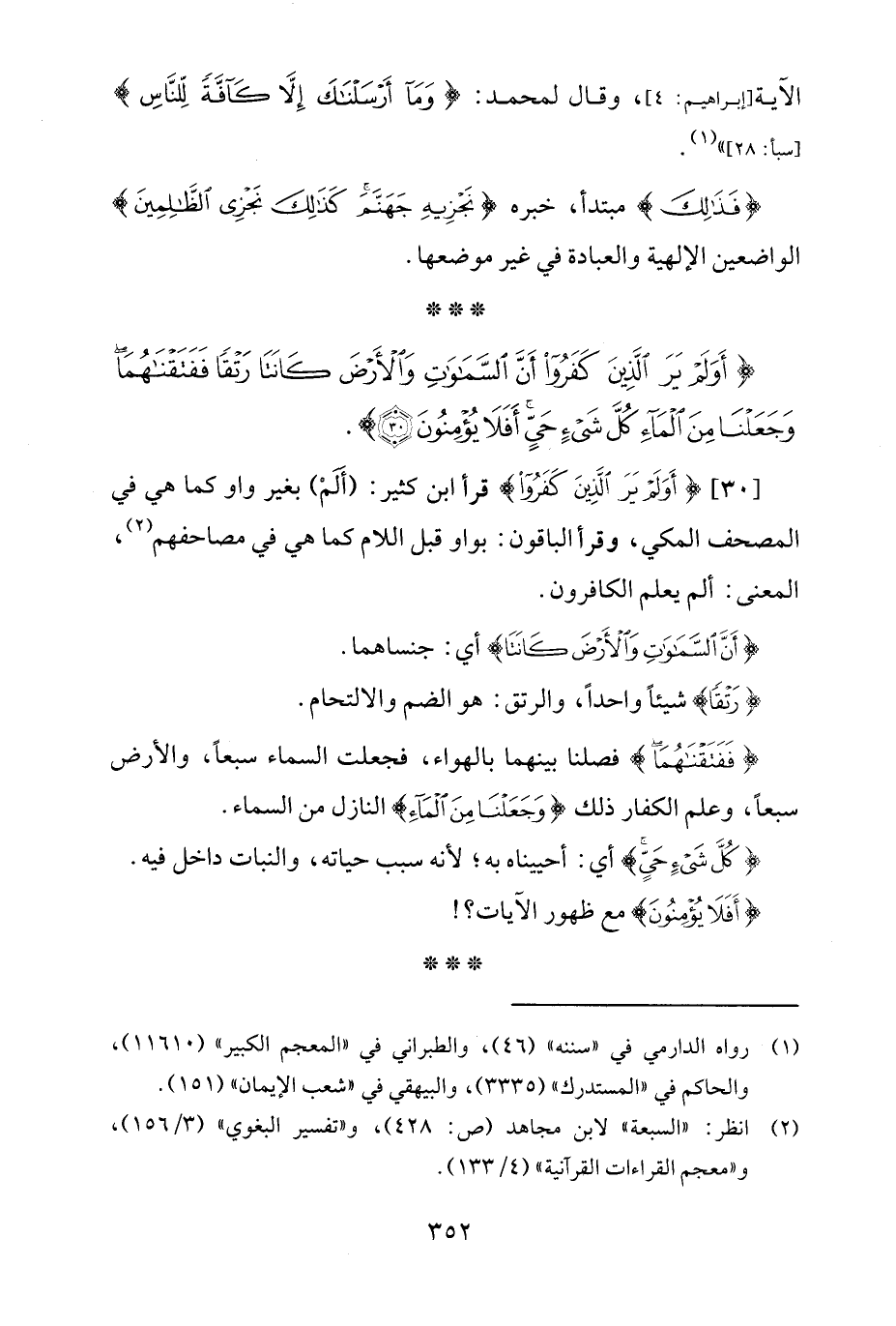[30] {أَوَلَمْ يَرَ الَّذِينَ كَفَرُوا} قرأ ابن كثير: (أَلَمْ) بغير واو كما هي في المصحف المكي، وقرأ الباقون: بواو قبل اللام كما هي في مصاحفهم (¬2)، المعنى: ألم يعلم الكافرون.