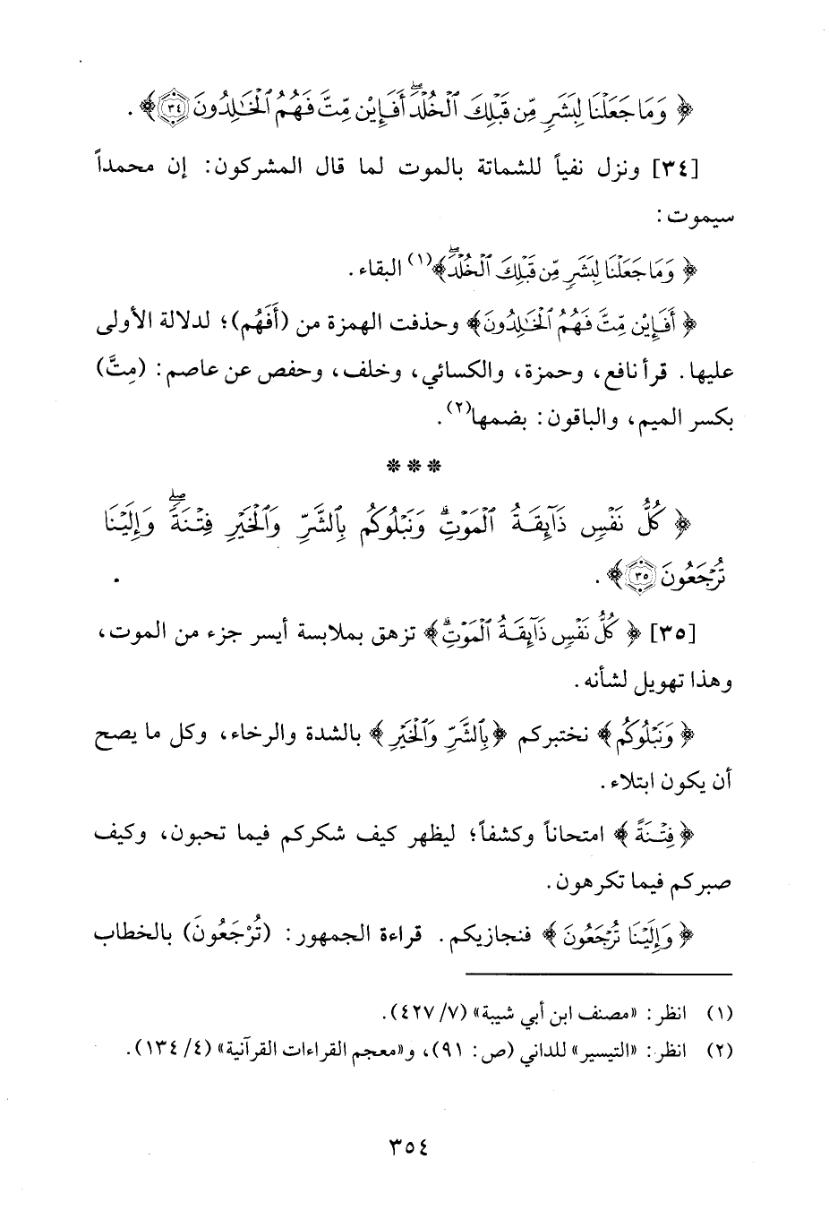 {أَفَإِنْ مِتَّ فَهُمُ الْخَالِدُونَ} وحذفت الهمزة من (أَفَهُم)؛ لدلالة الأولى عليها. قرأ نافع، وحمزة، والكسائي، وخلف، وحفص عن عاصم: (مِتَّ) بكسر الميم، والباقون: بضمها (¬2).