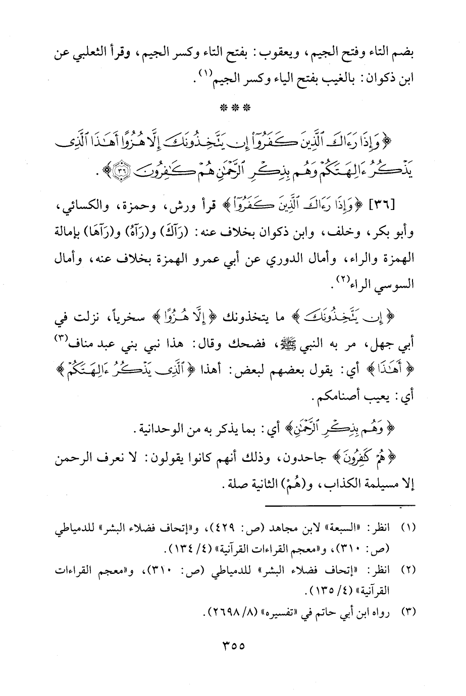 [36] {وَإِذَا رَآكَ الَّذِينَ كَفَرُوا} قرأ ورش، وحمزة، والكسائي، وأبو بكر، وخلف، وابن ذكوان بخلاف عنه: (رَآكَ) و (رَآهُ) و (رَآهَا) بإمالة الهمزة والراء، وأمال الدوري عن أبي عمرو الهمزة بخلاف عنه، وأمال السوسي الراء (¬2).