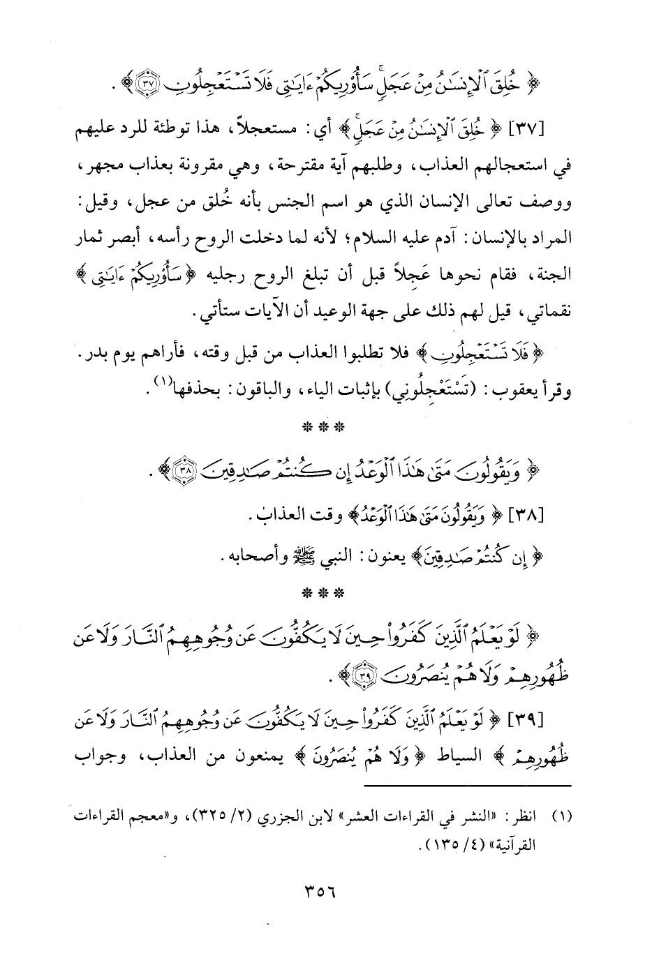 [37] {خُلِقَ الْإِنْسَانُ مِنْ عَجَلٍ} أي: مستعجلًا، هذا توطئة للرد عليهم في استعجالهم العذاب، وطلبهم آية مقترحة، وهي مقرونة بعذاب مجهر، ووصف تعالى الإنسان الذي هو اسم الجنس بأنه خُلق من عجل، وقيل: المراد بالإنسان: آدم عليه السلام، لأنه لما دخلت الروح رأسه، أبصر ثمار الجنة، فقام نحوها عَجِلًا قبل أن تبلغ الروح رجليه {سَأُرِيكُمْ آيَاتِي} نقماتي، قيل لهم ذلك على جهة الوعيد أن الآيات ستأتي.