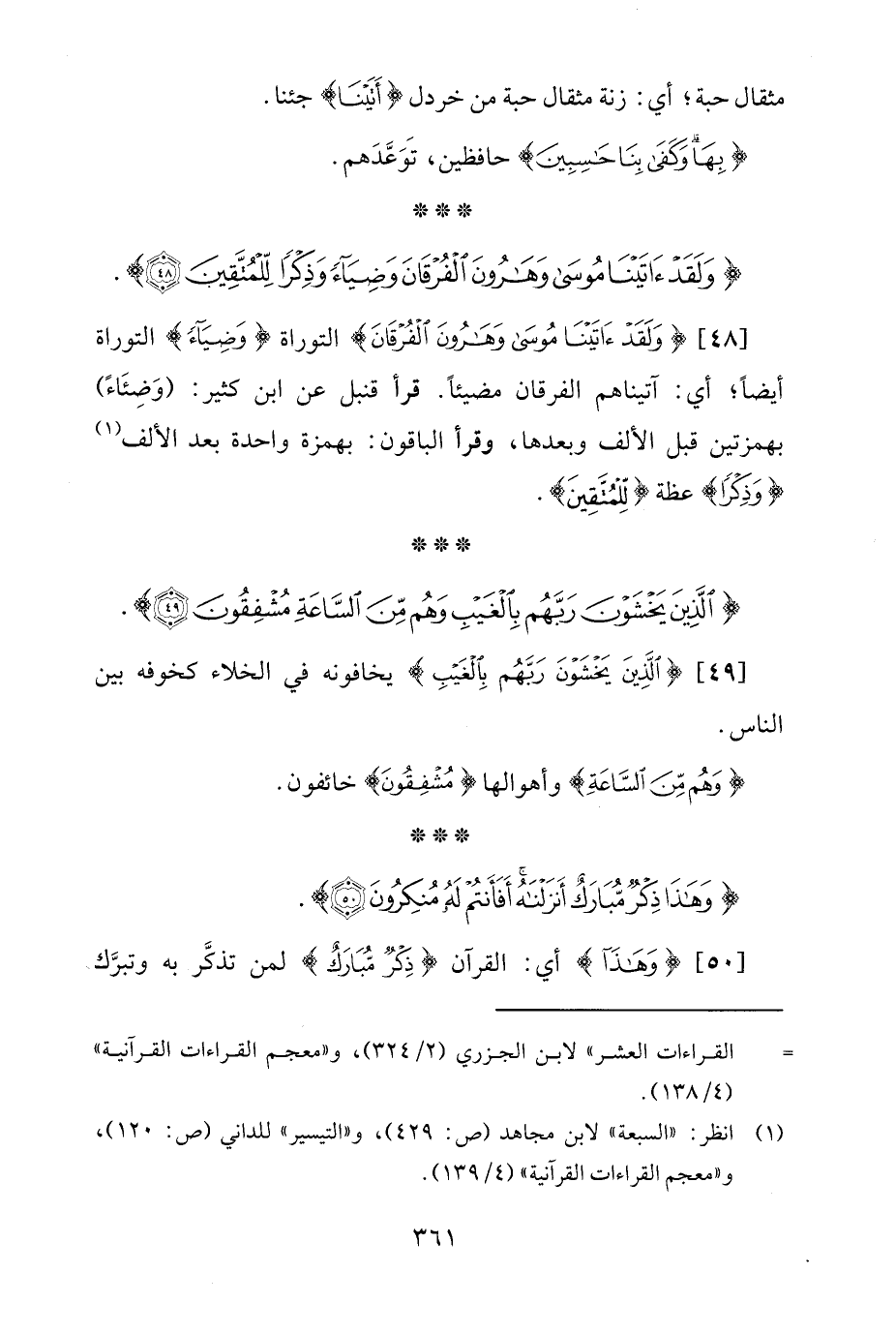 [48] {وَلَقَدْ آتَيْنَا مُوسَى وَهَارُونَ الْفُرْقَانَ} التوراة {وَضِيَاءً} التوراة أيضًا؛ أي: آتيناهم الفرقان مضيئًا. قرأ قنبل عن ابن كثير: (وَضِئَاءً) بهمزتين قبل الألف وبعدها، وقرأ الباقون: بهمزة واحدة بعد الألف (¬1) {وَذِكْرًا} عظة {لِلْمُتَّقِينَ}.