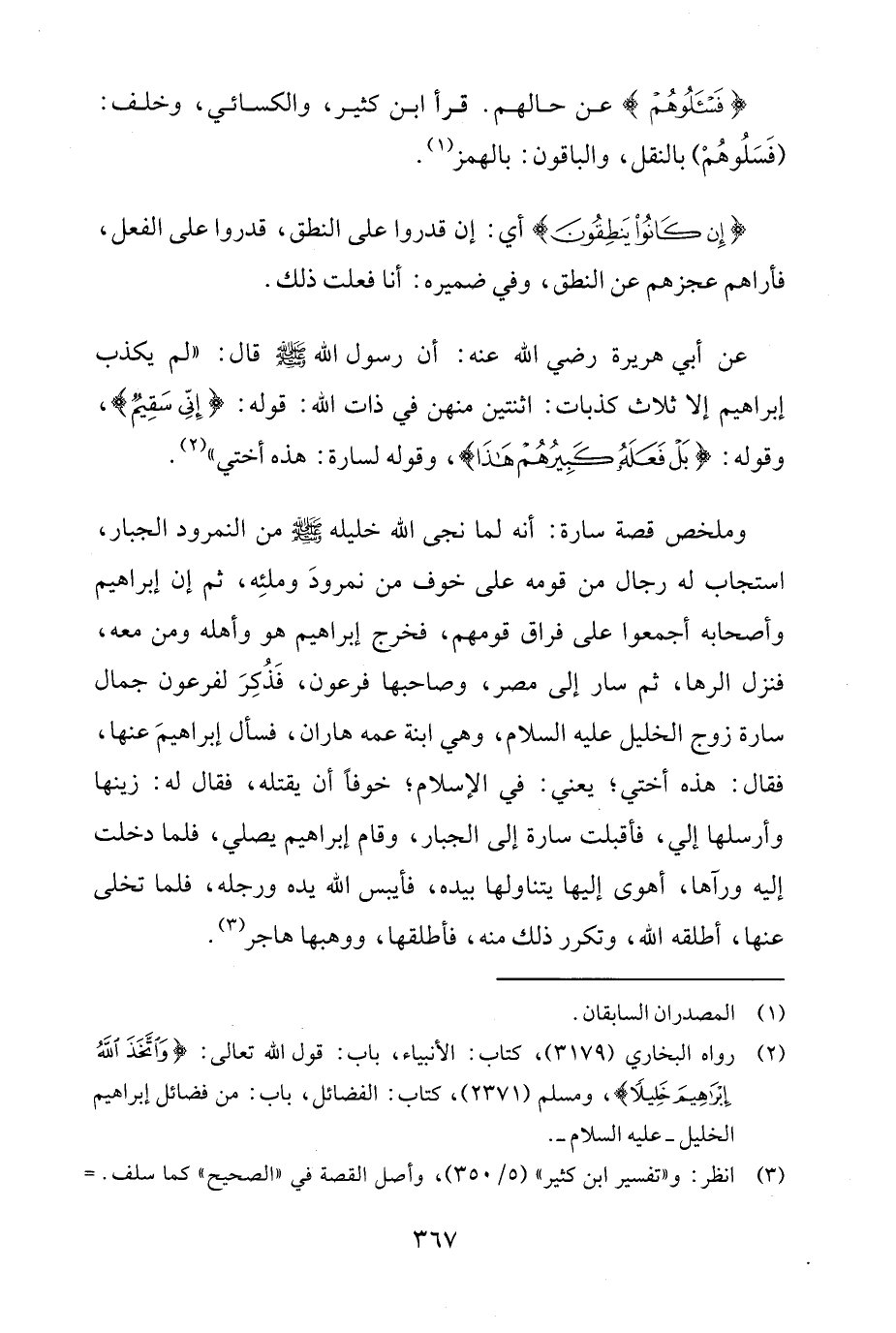 عن أبي هريرة رضي الله عنه: أن رسول الله - صلى الله عليه وسلم - قال: "لم يكذب إبراهيم إلا ثلاث كذبات: اثنتين منهن في ذات الله: قوله: {إِنِّي سَقِيمٌ}، وقوله: {بَلْ فَعَلَهُ كَبِيرُهُمْ هَذَا}، وقوله لسارة: هذه أختي" (¬2).