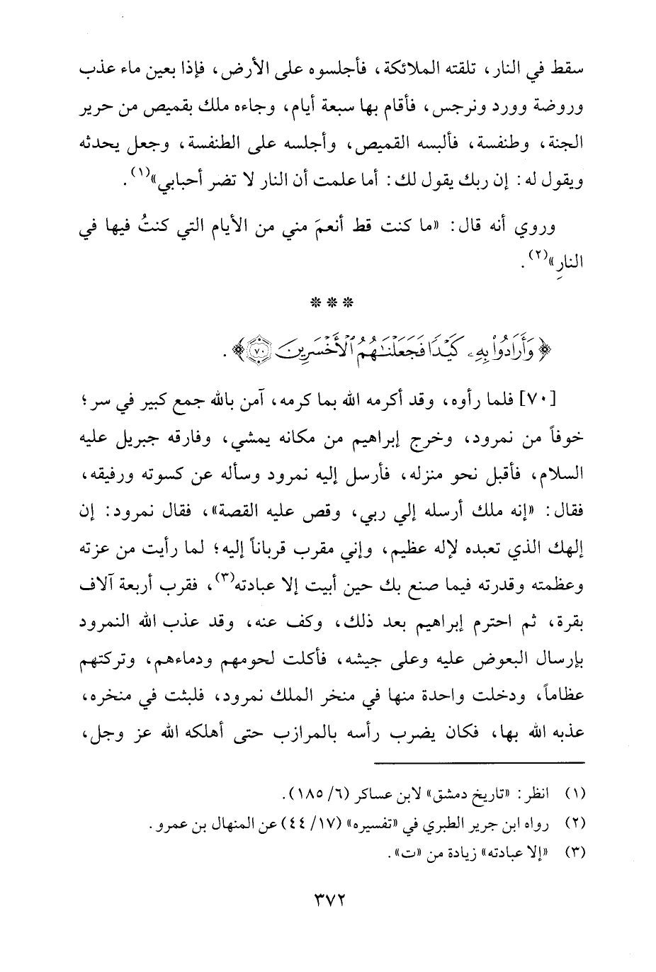 سقط في النار، تلقته الملائكة، فأجلسوه على الأرض، فإذا بعين ماء عذب وروضة وورد ونرجس، فأقام بها سبعة أيام، وجاءه ملك بقميص من حرير الجنة، وطنفسة، فألبسه القميص، وأجلسه على الطنفسة، وجعل يحدثه ويقول له: إن ربك يقول لك: أما علمت أن النار لا تضر أحبابي" (¬1).