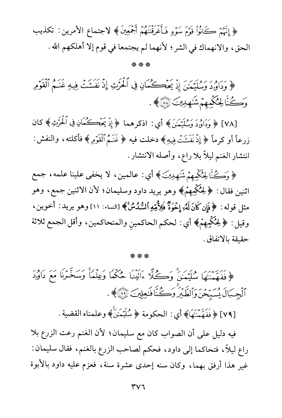 [78] {وَدَاوُودَ وَسُلَيْمَانَ} أي: اذكرهما {إِذْ يَحْكُمَانِ فِي الْحَرْثِ} كان زرعًا أو كرمًا {إِذ نَفَشَتْ فِيهِ} دخلت فيه {غَنَمُ الْقَوْمِ} فأكلته، والنفش: انتشار الغنم ليلًا بلا راع، وأصله الانتشار.