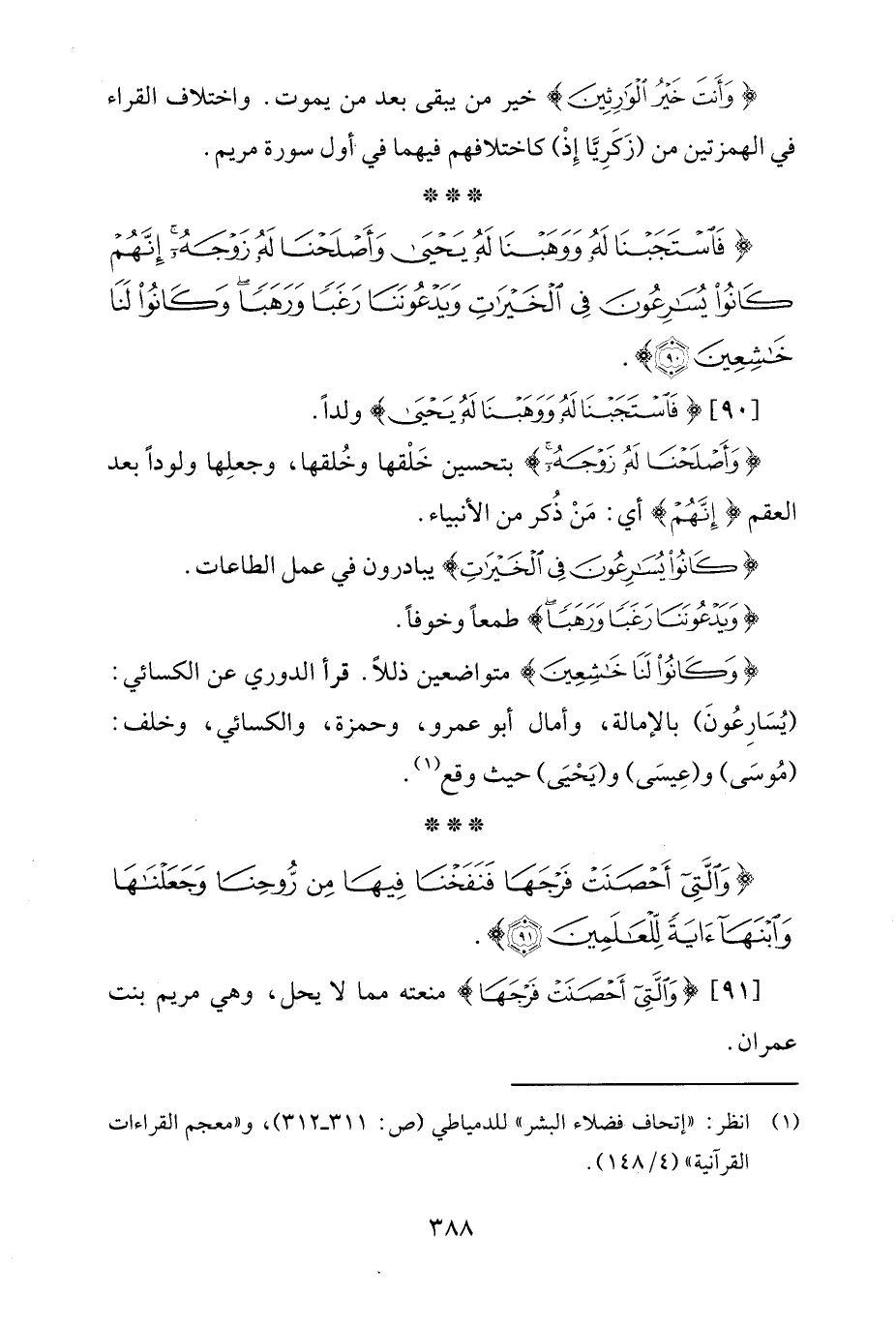 {وَكَانُوا لَنَا خَاشِعِينَ} متواضعين ذللًا. قرأ الدوري عن الكسائي: {يُسَارِعُونَ} بالإمالة، وأمال أبو عمرو، وحمزة، والكسائي، وخلف: (مُوسَى) و (عِيسَى) و (يَحْيَى) حيث وقع (¬1).