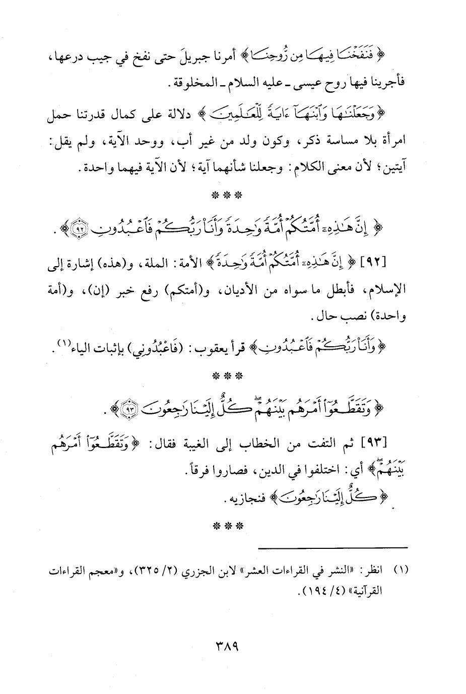 [92] {إِنَّ هَذِهِ أُمَّتُكُمْ أُمَّةً وَاحِدَةً} الأمة: الملة، و (هذه) إشارة إلى الإسلام، فأبطل ما سواه من الأديان، و (أمتكم) رفع خبر (إن)، و (أمة واحدة) نصب حال.