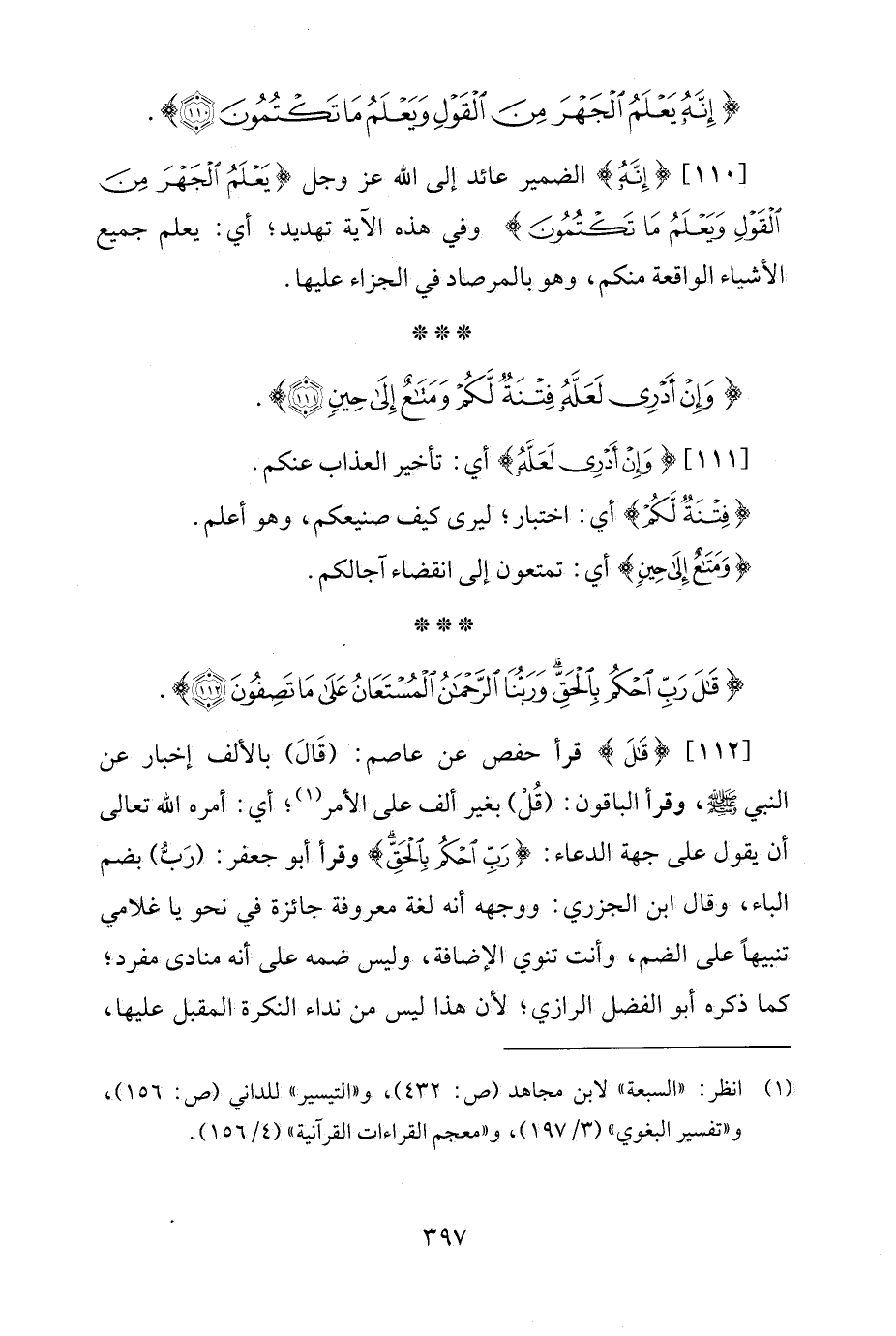[112] {قَالَ} قرأ حفص عن عاصم: (قَالَ) بالألف إخبار عن النبي - صلى الله عليه وسلم -، وقرأ الباقون: (قُلْ) بغير ألف على الأمر (¬1)؛ أي: أمره الله تعالى أن يقول على جهة الدعاء: {رَبِّ احْكُمْ بِالْحَقِّ} وقرأ أبو جعفر: (رَبُّ) بضم الباء، وقال ابن الجزري: ووجهه أنه لغة معروفة جائزة في نحو يا غلامي تنبيهًا على الضم، وأنت تنوي الإضافة، وليس ضمه على أنه منادى مفرد؛ كما ذكره أبو الفضل الرازي؛ لأن هذا ليس من نداء النكرة المقبل عليها،
