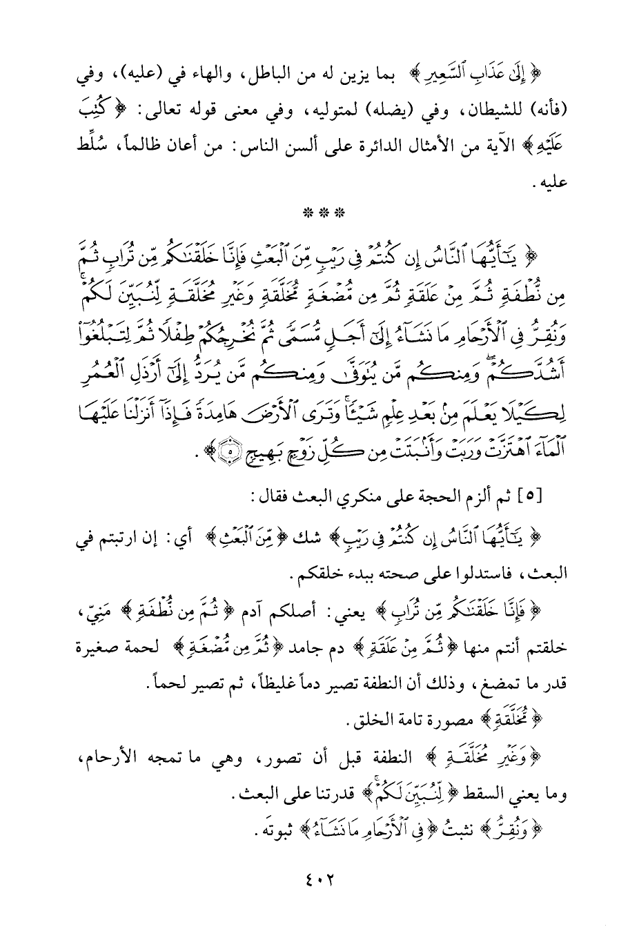 {يَاأَيُّهَا النَّاسُ إِنْ كُنْتُمْ فِي رَيْبٍ مِنَ الْبَعْثِ فَإِنَّا خَلَقْنَاكُمْ مِنْ تُرَابٍ ثُمَّ مِنْ نُطْفَةٍ ثُمَّ مِنْ عَلَقَةٍ ثُمَّ مِنْ مُضْغَةٍ مُخَلَّقَةٍ وَغَيْرِ مُخَلَّقَةٍ لِنُبَيِّنَ لَكُمْ وَنُقِرُّ فِي الْأَرْحَامِ مَا نَشَاءُ إِلَى أَجَلٍ مُسَمًّى ثُمَّ نُخْرِجُكُمْ طِفْلًا ثُمَّ لِتَبْلُغُوا أَشُدَّكُمْ وَمِنْكُمْ مَنْ يُتَوَفَّى وَمِنْكُمْ مَنْ يُرَدُّ إِلَى أَرْذَلِ الْعُمُرِ لِكَيْلَا يَعْلَمَ مِنْ بَعْدِ عِلْمٍ شَيْئًا وَتَرَى الْأَرْضَ هَامِدَةً فَإِذَا أَنْزَلْنَا عَلَيْهَا الْمَاءَ اهْتَزَّتْ وَرَبَتْ وَأَنْبَتَتْ مِنْ كُلِّ زَوْجٍ بَهِيجٍ (5)} [الحج: 5].