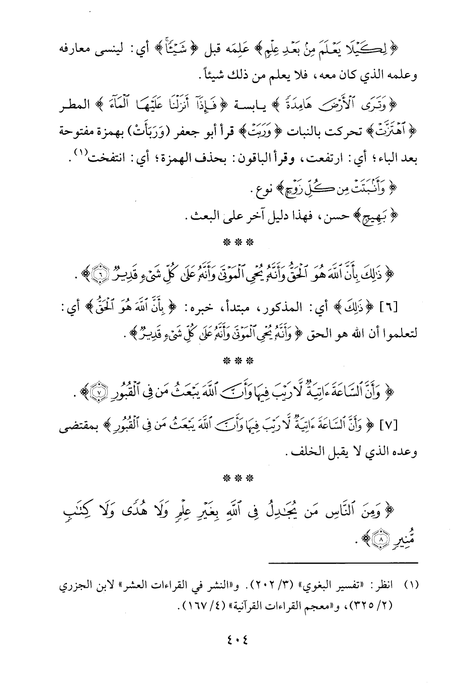 [6] {ذَلِكَ} أي: المذكور، مبتدأ، خبره: {بِأَنَّ اللَّهَ هُوَ الْحَقُّ} أي: لتعلموا أن الله هو الحق {وَأَنَّهُ يُحْيِ الْمَوْتَى وَأَنَّهُ عَلَى كُلِّ شَيْءٍ قَدِيرٌ}.