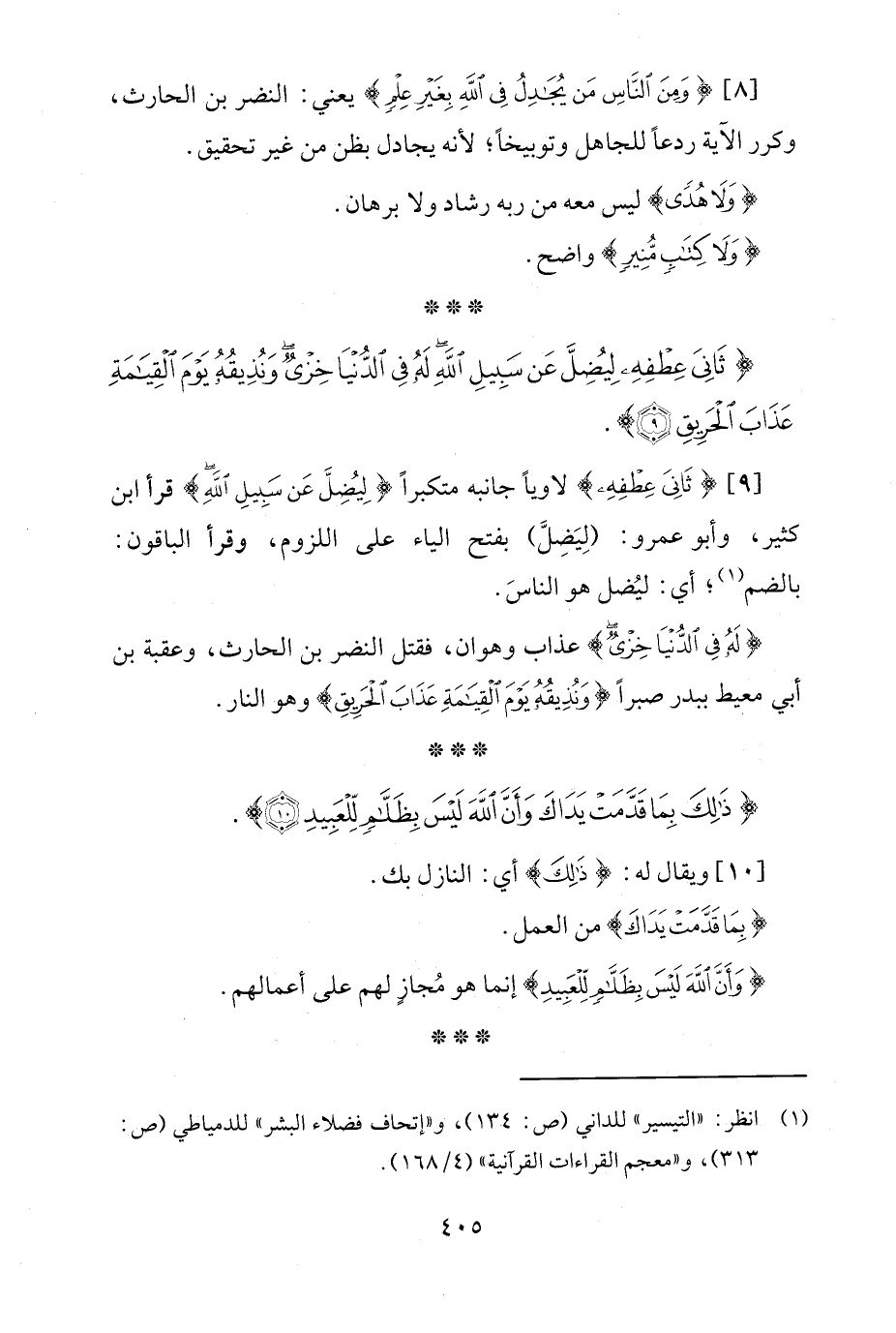 [8] {وَمِنَ النَّاسِ مَنْ يُجَادِلُ فِي اللَّهِ بِغَيْرِ عِلْمٍ} يعني: النضر بن الحارث، وكرر الآية ردعًا للجاهل وتوبيخًا؛ لأنه يجادل بظن من غير تحقيق.