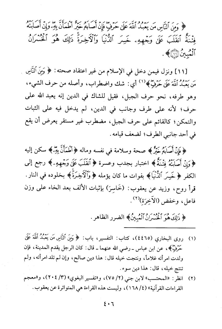 (¬1) روى البخاري (4465)، كتاب: التفسير، باب: {وَمِنَ النَّاسِ مَنْ يَعْبُدُ اللَّهَ عَلَى حَرْفٍ}، عن ابن عباس -رضي الله عنهما- قال: كان الرجل يقدم المدينة، فإن ولدت امرأته غلامًا، ونتجت خيله قال: هذا دين صالح، وإن لم تلد امرأته، ولم تنتج خيله، قال: هذا دين سوء.