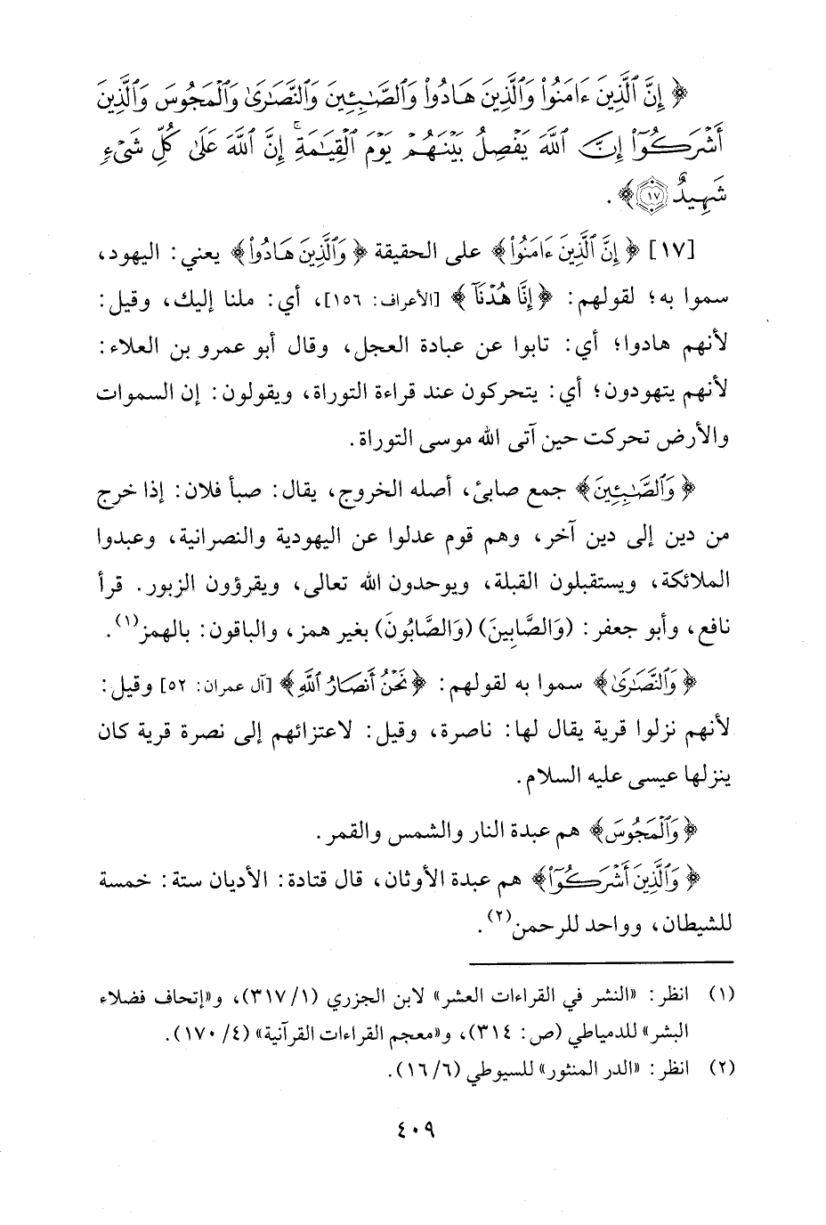 [17] {إِنَّ الَّذِينَ آمَنُوا} على الحقيقة {وَالَّذِينَ هَادُوا} يعني: اليهود، سموا به؛ لقولهم: {إِنَّا هُدْنَا} [الأعراف: 156]، أي: ملنا إليك، وقيل: لأنهم هادوا؛ أي: تابوا عن عبادة العجل، وقال أبو عمرو بن العلاء: لأنهم يتهودون؛ أي: يتحركون عند قراءة التوراة، ويقولون: إن السموات والأرض تحركت حين آتى الله موسى التوراة.