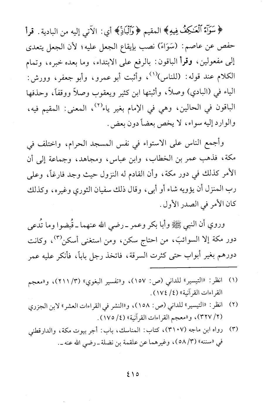 وأجمع الناس على الاستواء في نفس المسجد الحرام، واختلف في مكة، فذهب عمر بن الخطاب، وابن عباس، ومجاهد، وجماعة إلى أن الأمر كذلك في دور مكة، وأن القادم له النزول حيث وجد فارغًا، وعلى رب المنزل أن يؤويه شاء أو أبي، وقال ذلك سفيان الثوري وغيره، وكذلك كان الأمر في الصدر الأول.