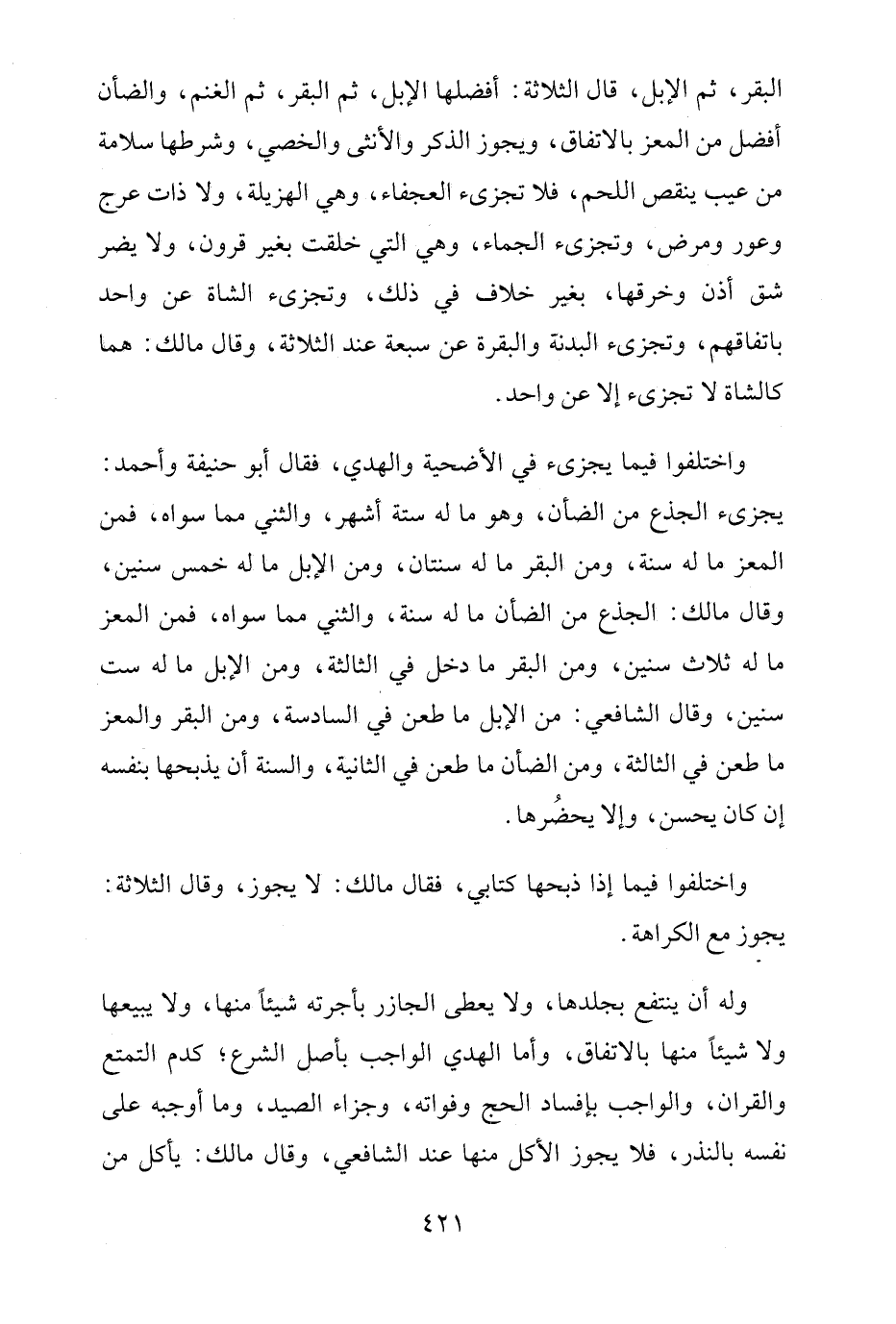 واختلفوا فيما يجزئ في الأضحية والهدي، فقال أبو حنيفة وأحمد: يجزئ الجذع من الضأن، وهو ما له ستة أشهر، والثني مما سواه، فمن المعز ما له سنة، ومن البقر ما له سنتان، ومن الإبل ما له خمس سنين، وقال مالك: الجذع من الضأن ما له سنة، والثني مما سواه، فمن المعز ما له ثلاث سنين، ومن البقر ما دخل في الثالثة، ومن الإبل ما له ست سنين، وقال الشافعي: من الإبل ما طعن في السادسة، ومن البقر والمعز ما طعن في الثالثة، ومن الضأن ما طعن في الثانية، والسنة أن يذبحها بنفسه إن كان يحسن، وإلا يحضُرها.