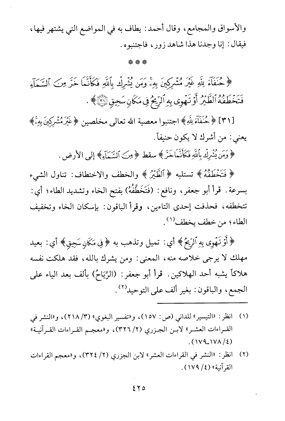 {حُنَفَاءَ لِلَّهِ غَيْرَ مُشْرِكِينَ بِهِ وَمَنْ يُشْرِكْ بِاللَّهِ فَكَأَنَّمَا خَرَّ مِنَ السَّمَاءِ فَتَخْطَفُهُ الطَّيْرُ أَوْ تَهْوِي بِهِ الرِّيحُ فِي مَكَانٍ سَحِيقٍ (31)}.