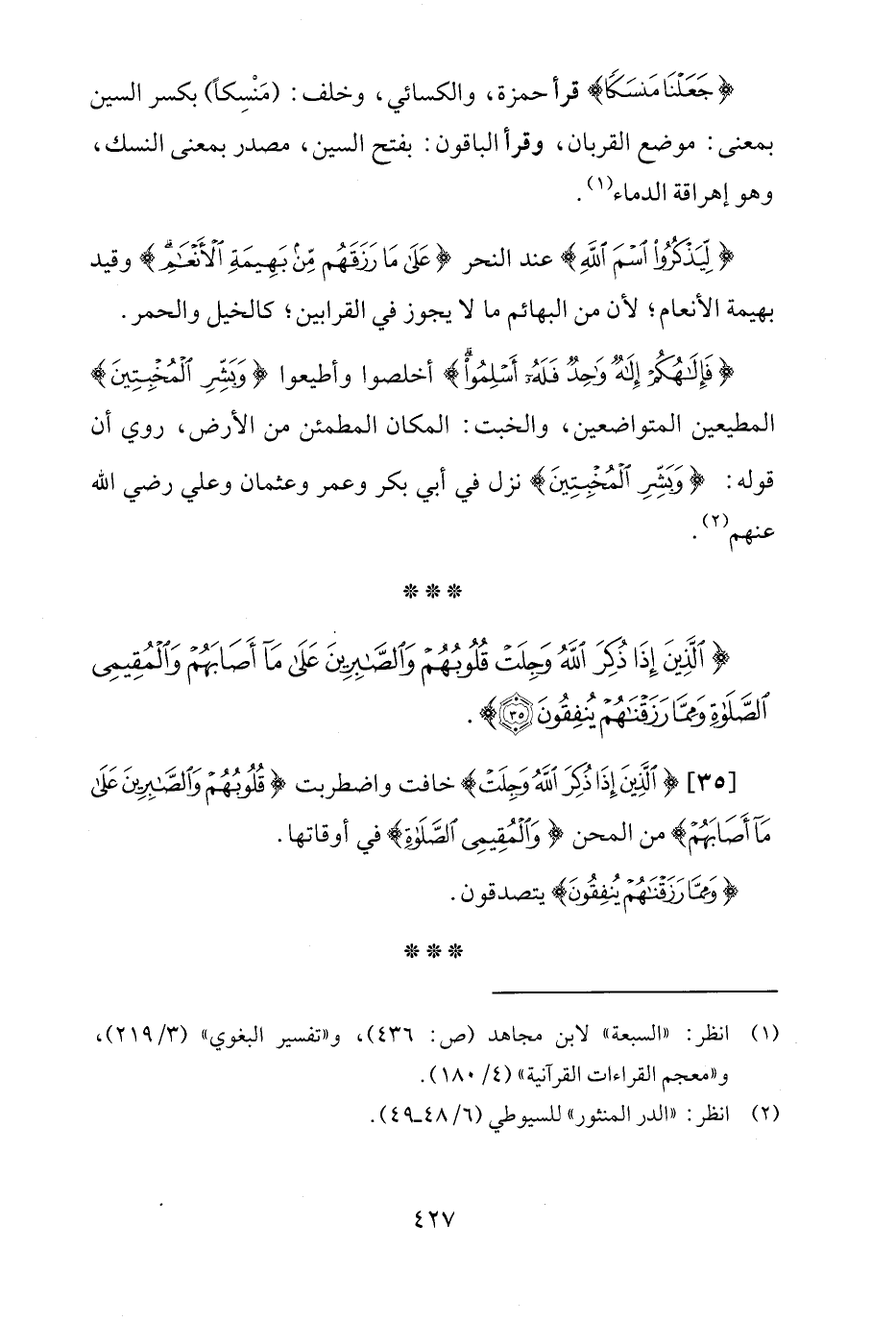 {الَّذِينَ إِذَا ذُكِرَ اللَّهُ وَجِلَتْ قُلُوبُهُمْ وَالصَّابِرِينَ عَلَى مَا أَصَابَهُمْ وَالْمُقِيمِي الصَّلَاةِ وَمِمَّا رَزَقْنَاهُمْ يُنْفِقُونَ (35)}.