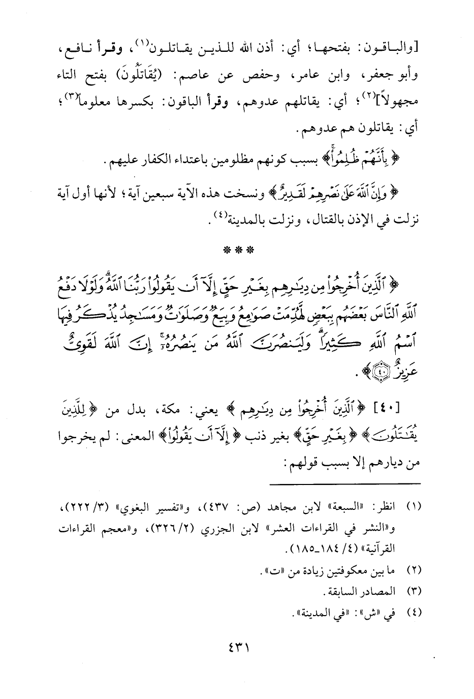 [40] {الَّذِينَ أُخْرِجُوا مِنْ دِيَارِهِمْ} يعني: مكة، بدل من {لِلَّذِينَ يُقَاتَلُونَ} {بِغَيْرِ حَقٍّ} بغير ذنب {إِلَّا أَنْ يَقُولُوا} المعنى: لم يخرجوا من ديارهم إلا بسبب قولهم: