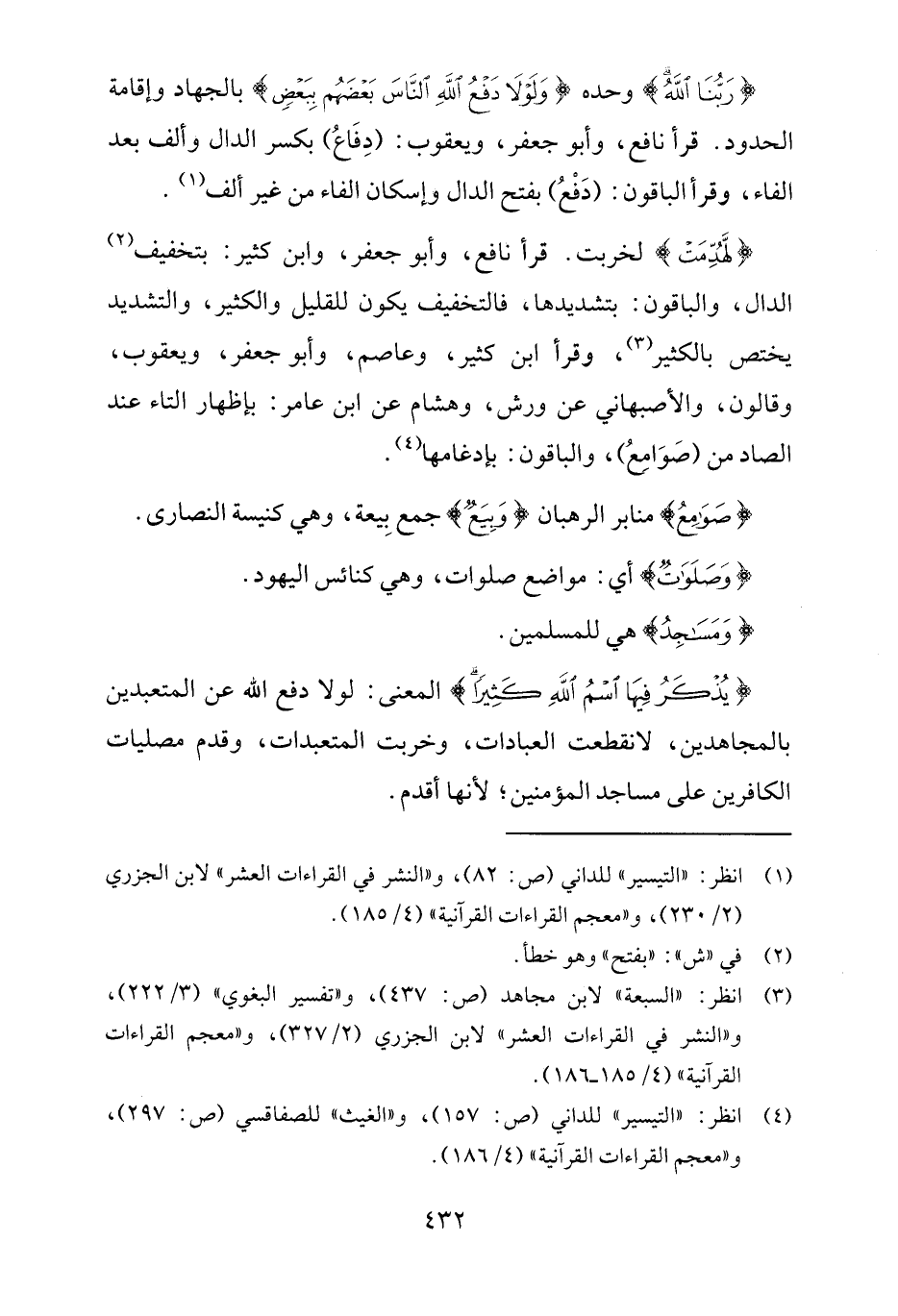 {لَهُدِّمَتْ} لخربت. قرأ نافع، وأبو جعفر، وابن كثير: بتخفيف (¬2) الدال، والباقون: بتشديدها، فالتخفيف يكون للقليل والكثير، والتشديد يختص بالكثير (¬3)، وقرأ ابن كثير، وعاصم، وأبو جعفر، ويعقوب، وقالون، والأصبهاني عن ورش، وهشام عن ابن عامر: بإظهار التاء عند الصاد من (صَوَامِعُ)، والباقون: بإدغامها (¬4).