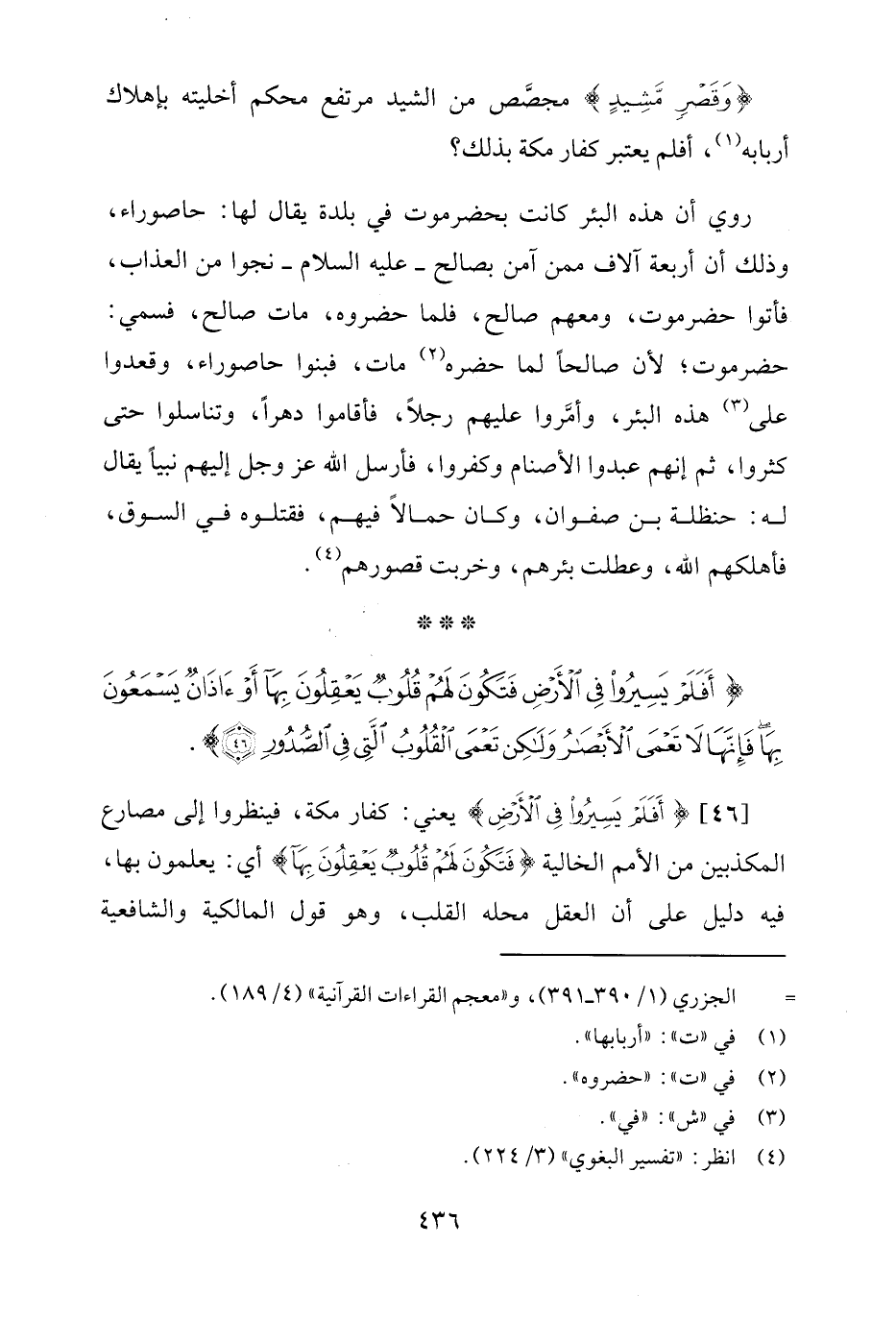 [46] {أَفَلَمْ يَسِيرُوا فِي الْأَرْضِ} يعني: كفار مكة، فينظروا إلى مصارع المكذبين من الأمم الخالية {فَتَكُونَ لَهُمْ قُلُوبٌ يَعْقِلُونَ بِهَا} أي: يعلمون بها، فيه دليل على أن العقل محله القلب، وهو قول المالكية والشافعية