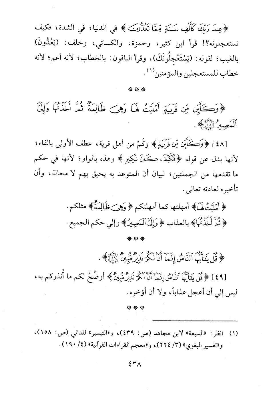 {عِنْدَ رَبِّكَ كَأَلْفِ سَنَةٍ مِمَّا تَعُدُّونَ} في الدنيا؛ في الشدة، فكيف تستعجلونه؟! قرأ ابن كثير، وحمزة، والكسائي، وخلف: (يَعُدُّونَ) بالغيب؛ لقوله: (يَسْتَعْجِلُونَكَ)، وقرأ الباقون: بالخطاب؛ لأنه أعم؛ لأنه خطاب للمستعجلين والمؤمنين (¬1).