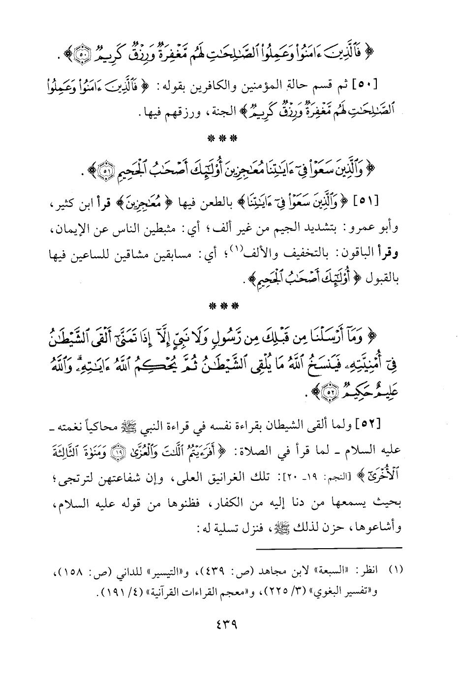 [52] ولما ألقى الشيطان بقراءة نفسه في قراءة النبي - صلى الله عليه وسلم - محاكيًا نغمته - عليه السلام - لما قرأ في الصلاة: {أَفَرَأَيْتُمُ اللَّاتَ وَالْعُزَّى (19) وَمَنَاةَ الثَّالِثَةَ الْأُخْرَى} [النجم: 19، 20]: تلك الغرانيق العلى، وإن شفاعتهن لترتجى؛ بحيث يسمعها من دنا إليه من الكفار، فظنوها من قوله عليه السلام، وأشاعوها، حزن لذلك - صلى الله عليه وسلم -، فنزل تسلية له: