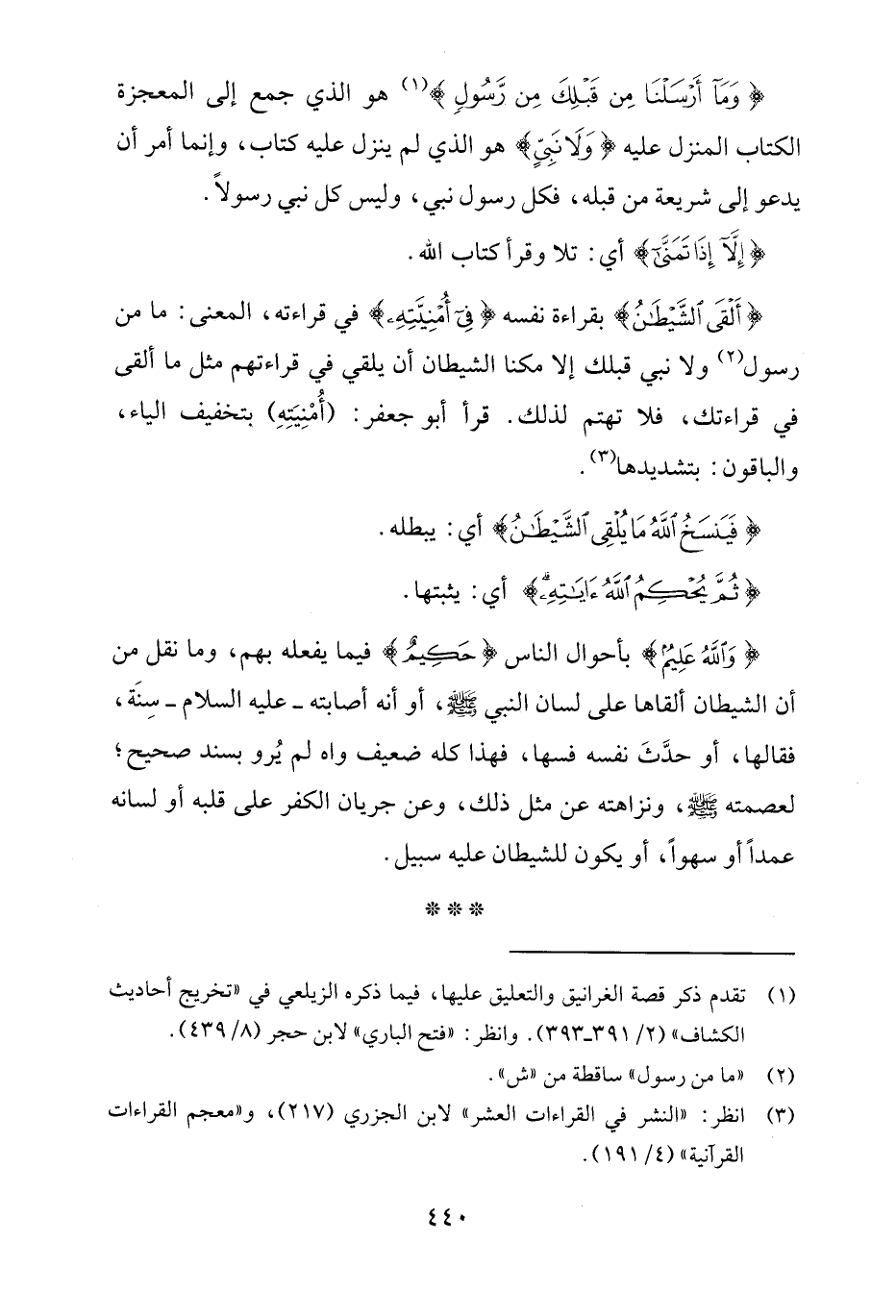 (¬1) تقدم ذكر قصة الغرانيق والتعليق عليها، فيما ذكره الزيلعي في "تخريج أحاديث الكشاف" (2/ 391 - 393). وانظر: "فتح الباري" لابن حجر (8/ 439).