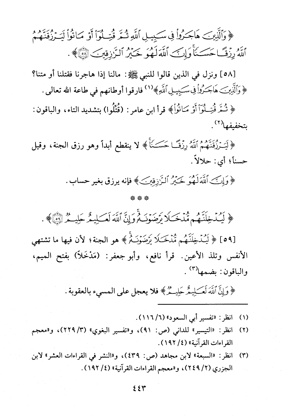 [59] {لَيُدْخِلَنَّهُمْ مُدْخَلًا يَرْضَوْنَهُ} هو الجنة؛ لأن فيها ما تشتهي الأنفس وتلذ الأعين. قرأ نافع، وأبو جعفر: (مَدْخَلًا) بفتح الميم، والباقون: بضمها (¬3).